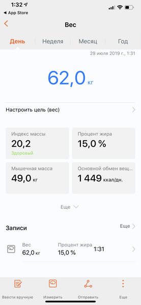 Итак, мы попробовали сделать подряд измерение на весах Huawei и Runtastic. Результаты — перед вами. По скриншотам видно, что измерения сделаны с разницей всего в несколько минут.