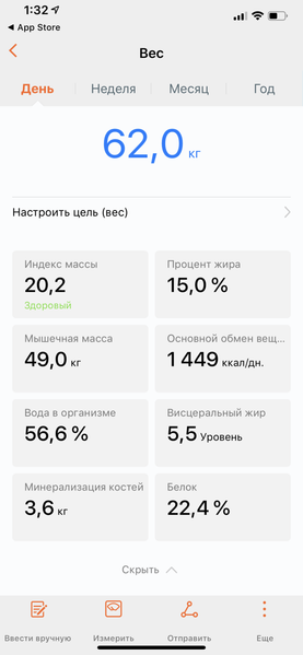 Благодаря экрану мы можем узнать свой вес и процент жира без использования смартфона, что, разумеется, удобно для повседневных измерений. При следующем запуске мобильного приложения весы передадут данные в него, так что вся статистика сохранится. Однако это только два параметра из девяти возможных. Остальные же измеряются только при активном подключении к смартфону. О том, как это происходит и что дает, мы расскажем в следующем разделе статьи.