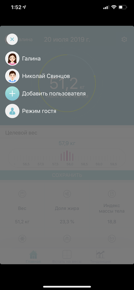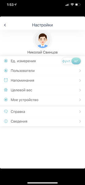 Но о точности измерения мы еще поговорим. А пока вернемся на главный экран и посмотрим настройки (это иконка шестеренки в правом верхнем углу). В принципе, после первоначальной настройки туда заглядывать вовсе не обязательно, но если вы захотите добавить другого пользователя — это один из вариантов. Другой — нажать на круглую аватарку на главном экране и выбрать «Добавить пользователя». Там же происходит и переключение между пользователями.