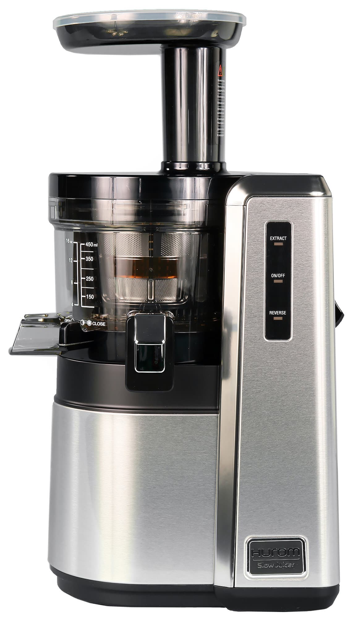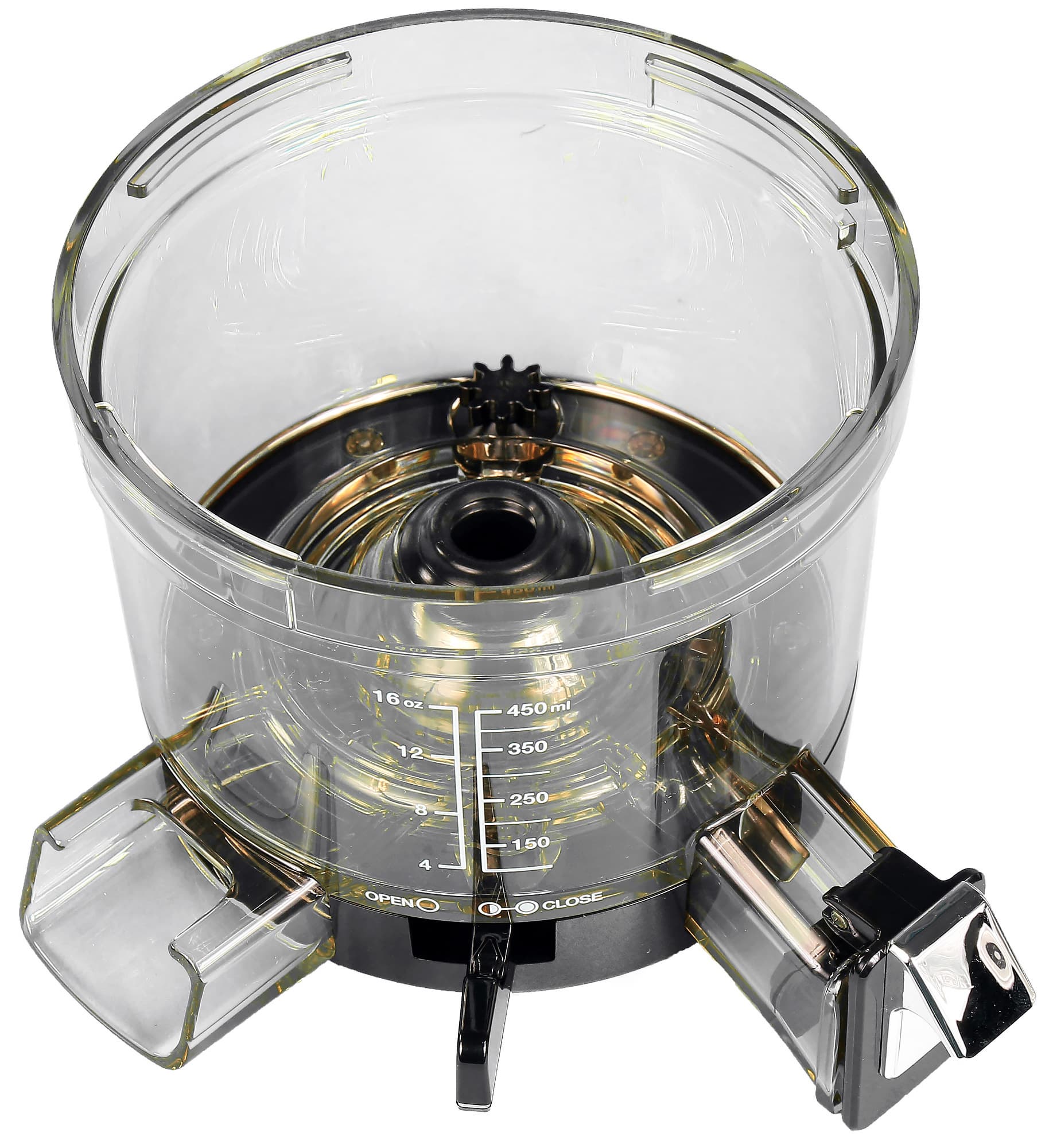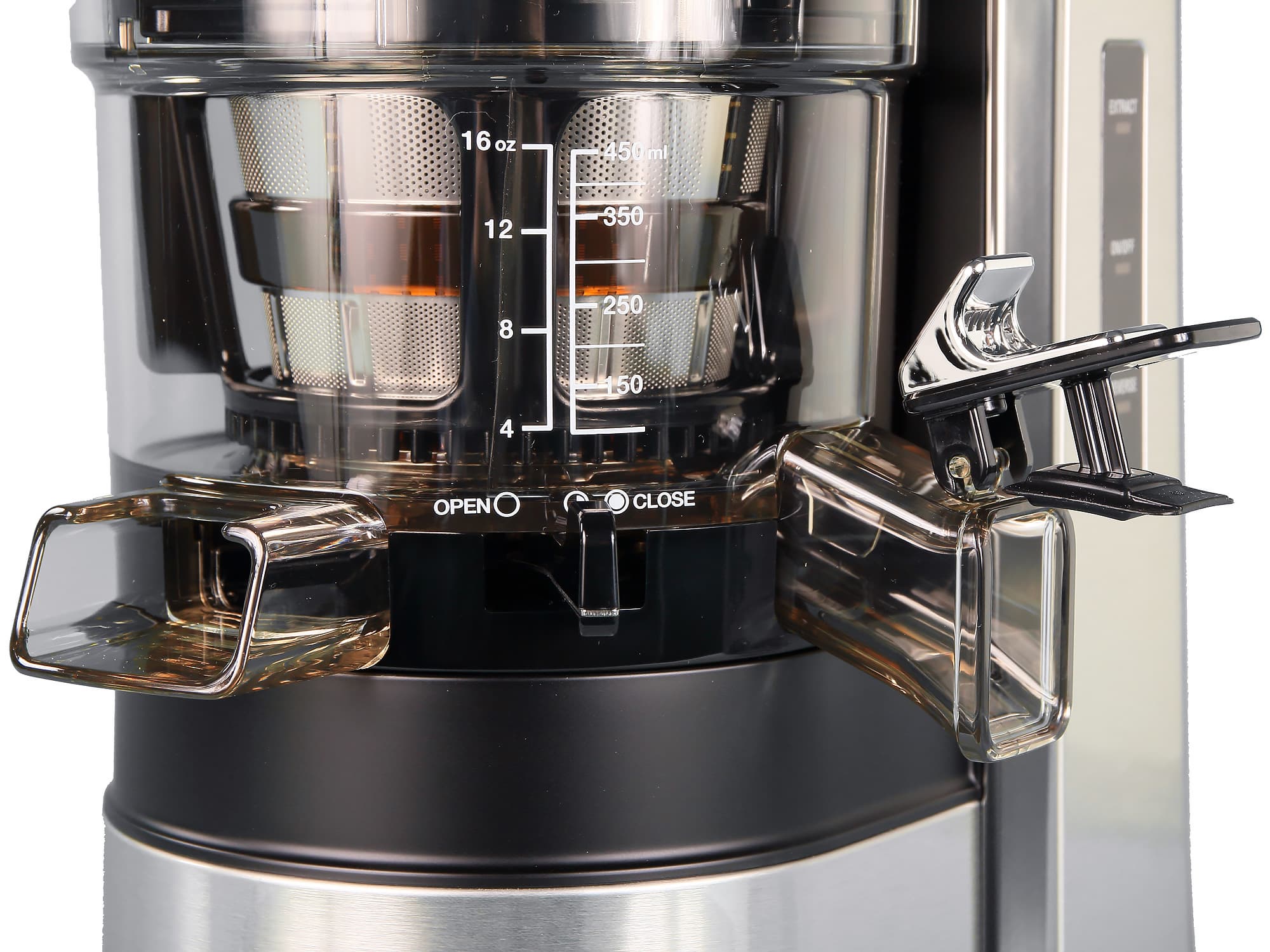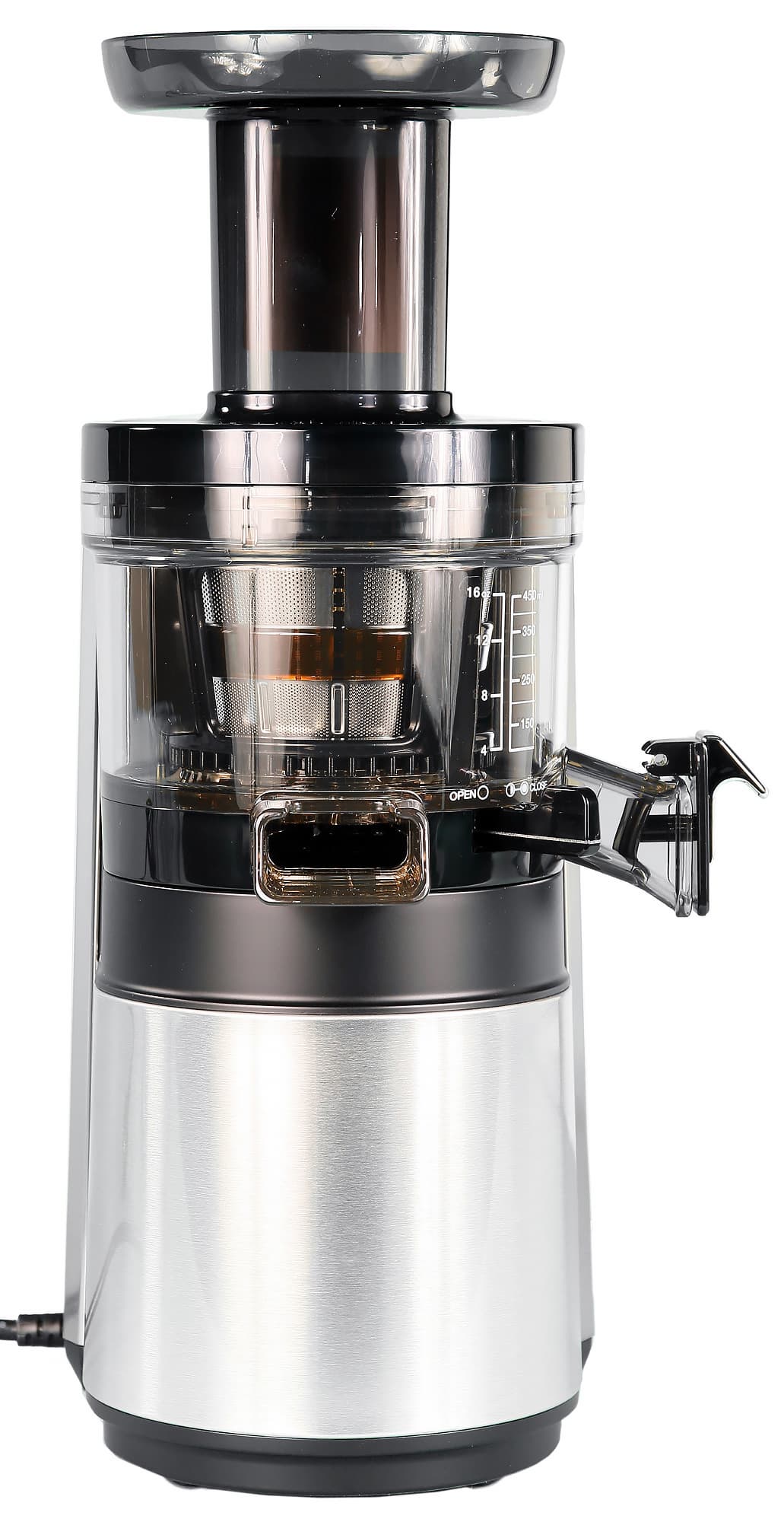 На корзине имеется градуировка для измерения объема сока — от 4 до 16 унций с шагом в 4 унции и от 100 до 450 мл с шагом в 50 мл.