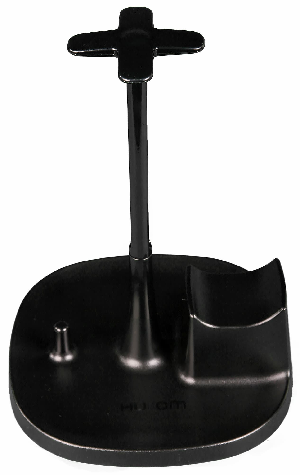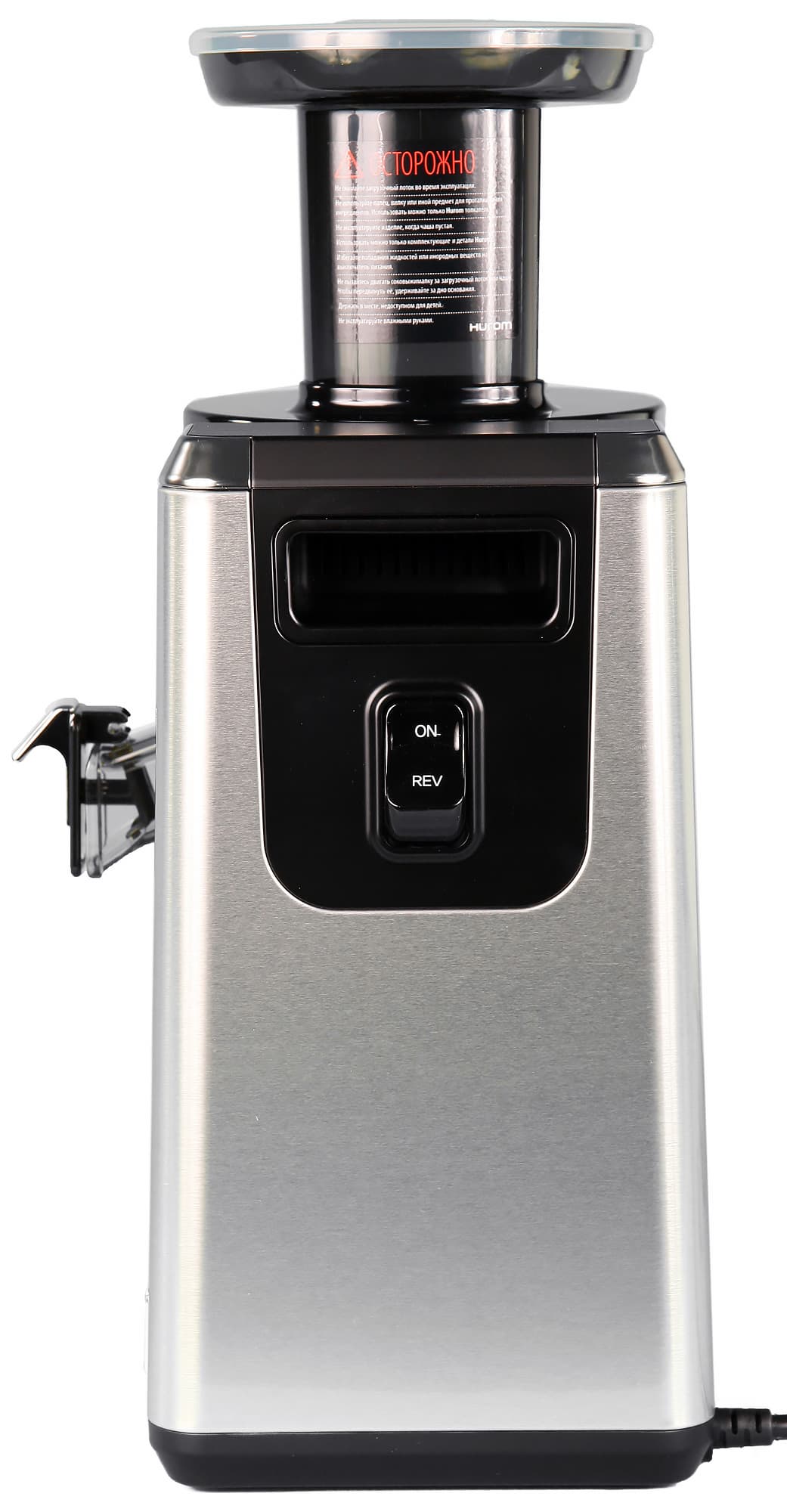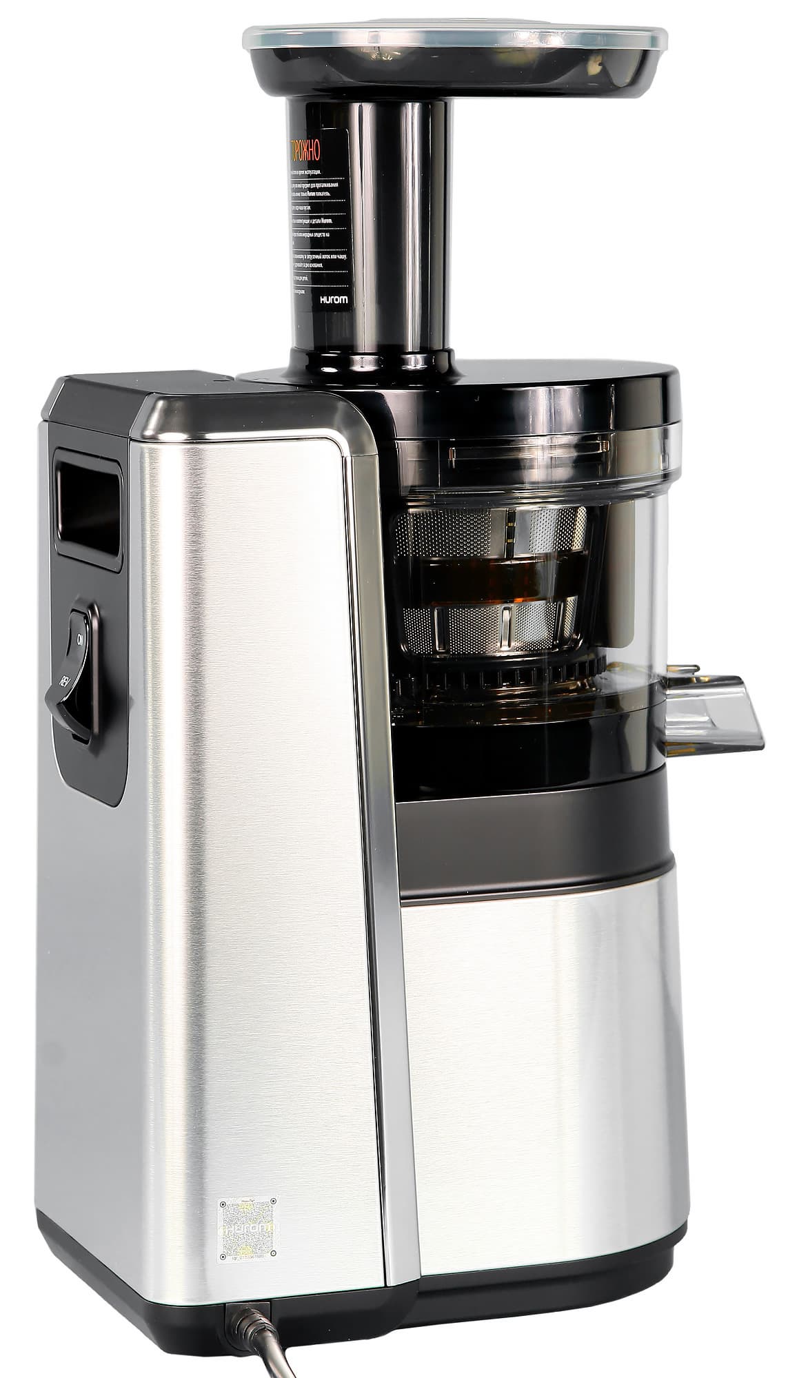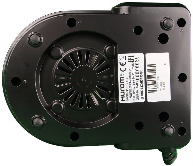 На боковых стенках моторного блока также можно заметить стильный металлический «шильдик» с логотипом Hurom и голографическую наклейку с qr-кодом, с помощью которой можно проверить подлинность соковыжималки. Для этого, правда, потребуется установить специальное приложение от Hurom. Воспользоваться обычным сканером для qr-кодов не удастся. Шнур питания крепится сбоку. Специального отсека для его хранения у соковыжималки не предусмотрено.