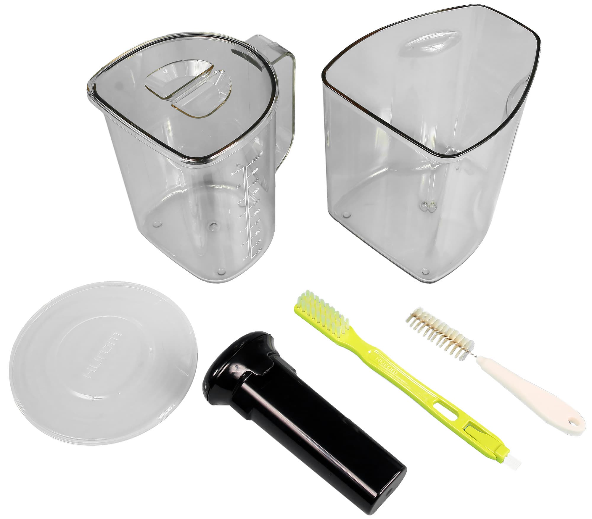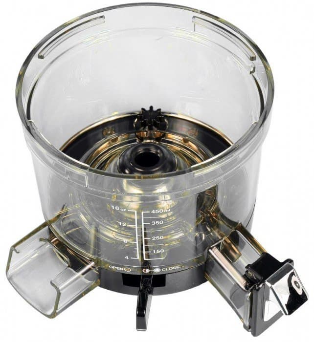 Стаканы для жмыха и сока сделаны из прозрачного пластика. Из него же сделана крышка стакана для сока. Стаканы с легкостью убираются один в другой, что упрощает их хранение. Стакан для сока имеет градуировку от 5 до 35 унций с шагом в 5 унций, а также от 100 до 1000 мл с шагом в 100 мл.