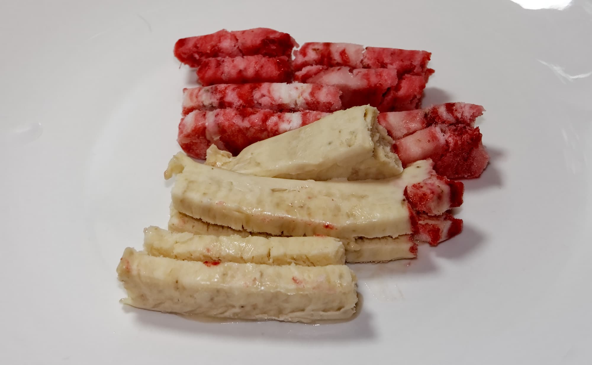 Для этого теста мы заморозили несколько предварительно очищенных и нарезанных на кусочки бананов. В морозилке обнаружилась и замороженная клубника, которая также пошла в дело.