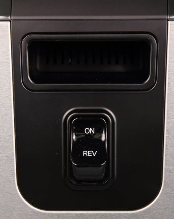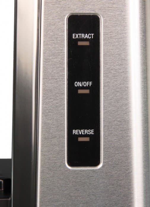 Стандартное (среднее) положение кнопки соответствует положению «выключено». В этом состоянии соковыжималка готова к работе, а слева на корпусе будет светиться индикатор подачи питания. Верхнее положение кнопки (On) соответствует нормальному режиму работы (отжима сока). Кнопка в этом положении фиксируется: соковыжималка будет работать до тех пор, пока пользователь ее не отключит. В режиме отжима загорается индикатор Extract. Нижнее положение кнопки соответствует режиму Reverse (загорается одноименный индикатор). В этом режиме шнек соковыжималки будет вращаться в обратную сторону, что может быть полезно, например, в случае, если частицы продуктов начали мешать вращению шнека. В режиме Reverse кнопка не фиксируется: обратное вращение будет происходить до тех пор, пока пользователь не отпустит кнопку.