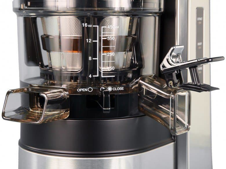 Однако есть и некоторые отличия. Первое из них — это наличие клапана, блокирующего выход жмыха. Данный клапан (рычаг) может находиться в трех положениях: полностью открыт (допускается только в разобранном состоянии, используется при очистке соковыжималки), полу-открыт (жмых выходит в процессе отжима) и закрыт (жмых остается в отжимной корзине, этот же режим используется при приготовлении мороженого или сорбета).