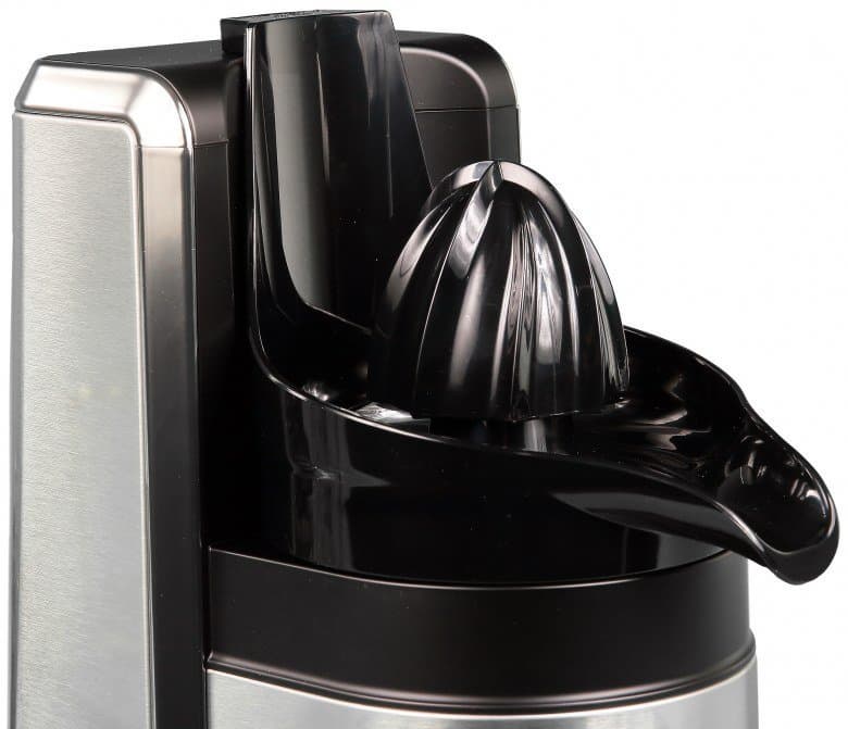 Как мы видим, комплектация у нашей соковыжималки премиального класса и правда оказалась расширенной. Впрочем, если присмотреться внимательнее, то становится понятно, что необычных деталей тут не так уж и много. Наше внимание в первую очередь привлекла насадка для отжима цитрусовых, которую не встретишь у бюджетных соковыжималок. Ну а наличие такие аксессуаров, как крышка для контейнера или дополнительная щетка для очистки, вряд ли может существенно повлиять на процесс эксплуатации прибора.