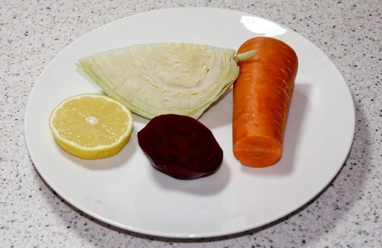 Для приготовления этого напитка нужно помыть и нарезать морковь и капусту, очистить свеклу от кожуры и нарезать ее, отрезать кусочек лимона прямо с кожурой.