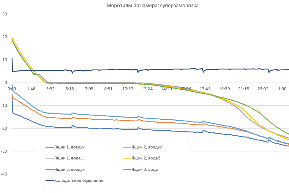 Средняя температура в морозильной камере оставалась ниже нуля в течение практически всего теста, что позволяет констатировать: заявленные 15 часов без электричества холодильник выдерживает со значительным превышением нормы.