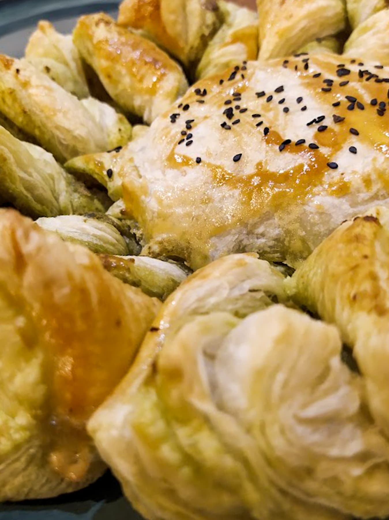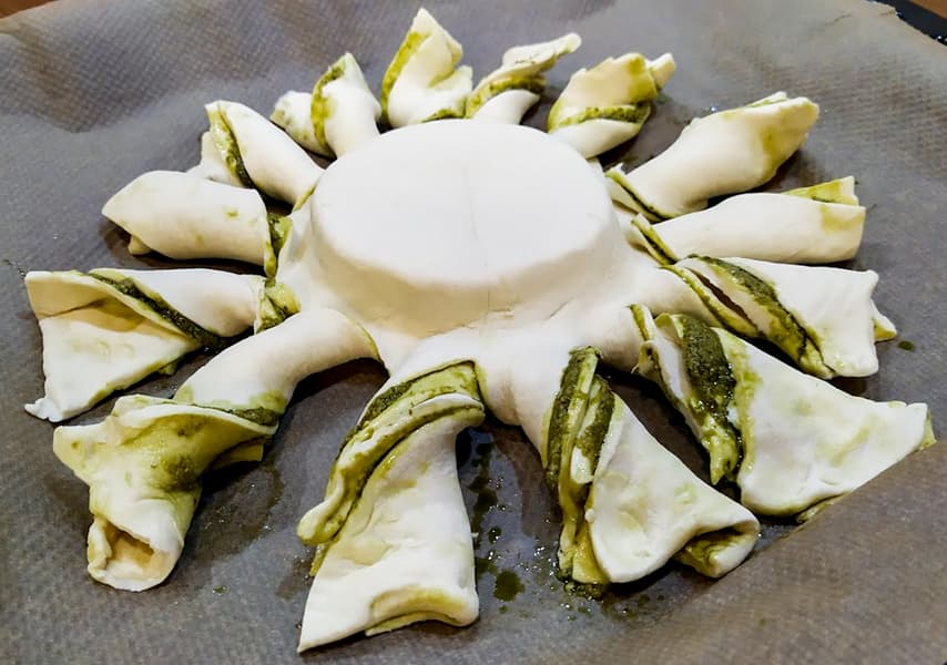 Кусок камамбера нашпиговали чесноком и укутали в слоеное тесто, промазанное песто, смазали желтком и поставили в духовку в режиме верхнего и нижнего нагрева при температуре 200 °C.