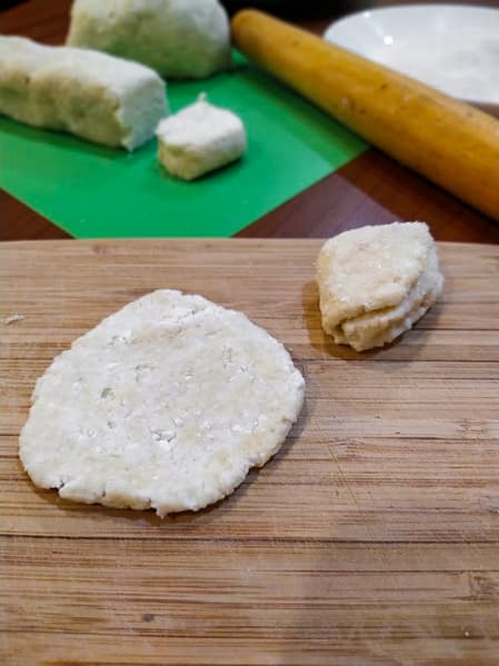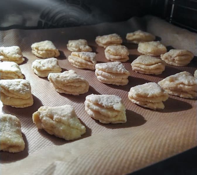 Мы порубили ножом творог, масло и полтора стакана муки, замесили тесто и положили его в холодильник на полтора часа. Затем скатали из теста колбаску, нарезали шайбочками и налепили из них печенюшки, называемые в народе «гусиные лапки».