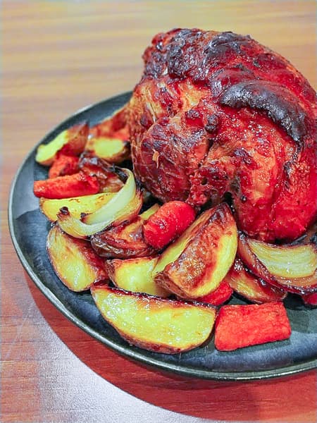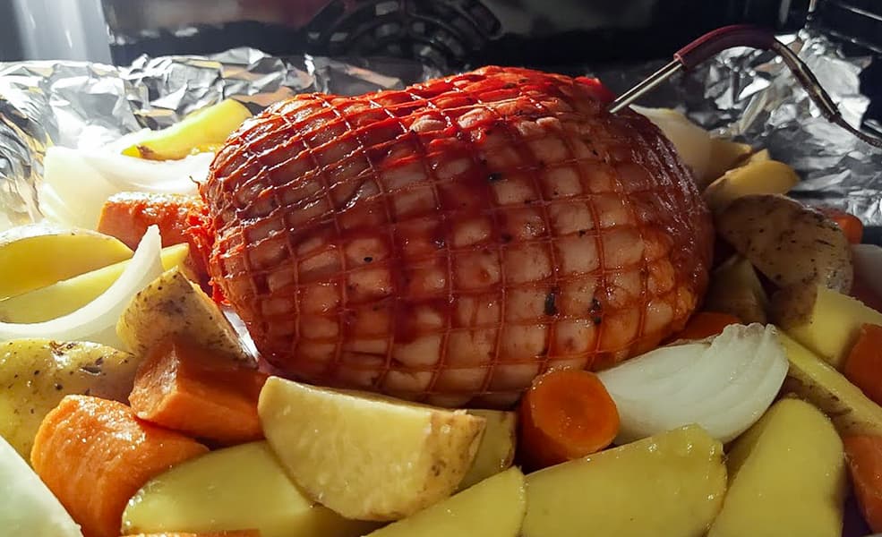 Замаринованный окорок уложили на противень в окружении приправленных картофеля, моркови и кусочков лука и отправили в разогретую до 200 °C духовку, выбрав режим «Интенсивное запекание». Через 20 минут температуру снизили и выключили конвекцию.
