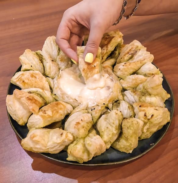 Замечательный вариант горячей закуски для вечеринки: каждый отламывает себе «лепесток» с песто и макает его в расплавленный ароматный камамбер. Кстати, вместо песто можно использовать классическое дополнение к сыру — клюквенный или брусничный джем.