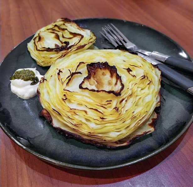 Не остались обделенными и дегустаторы-вегетарианцы. Для них мы приготовили капустные стейки. Кочан нарезали шайбами по 2 см толщиной и смазали их оливковым маслом со специями. Наши лабораторные запасы истощились, поэтому мы использовали чеснок и перец, хотя не помешала бы паприка или прованские травы.