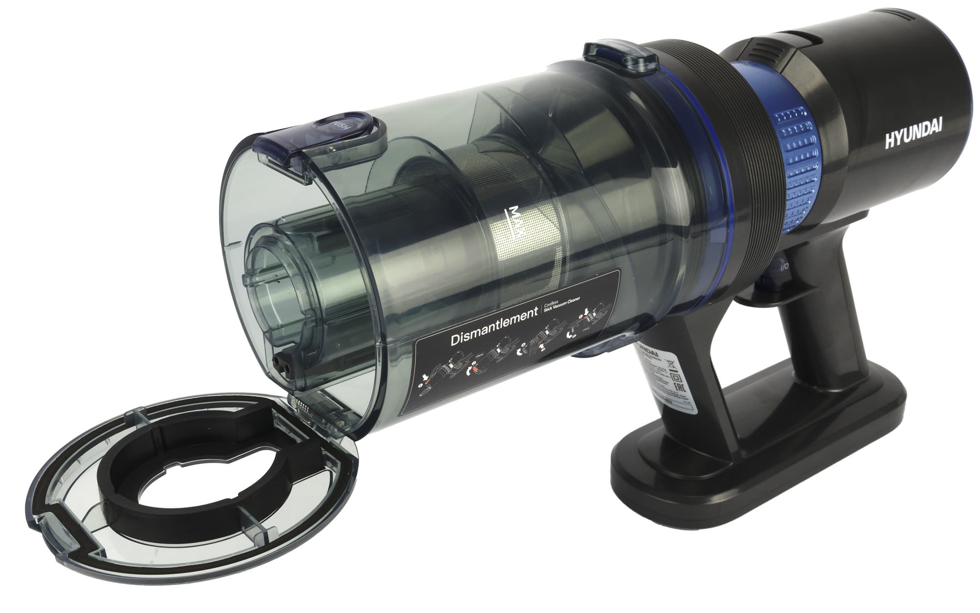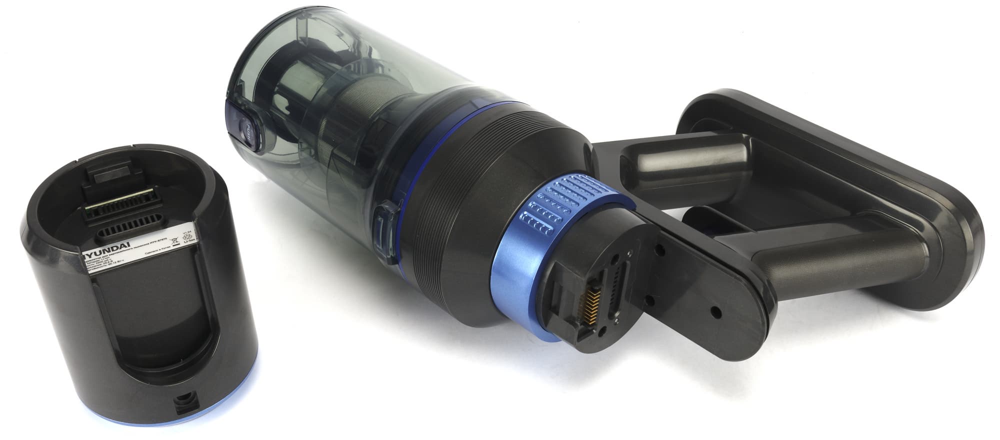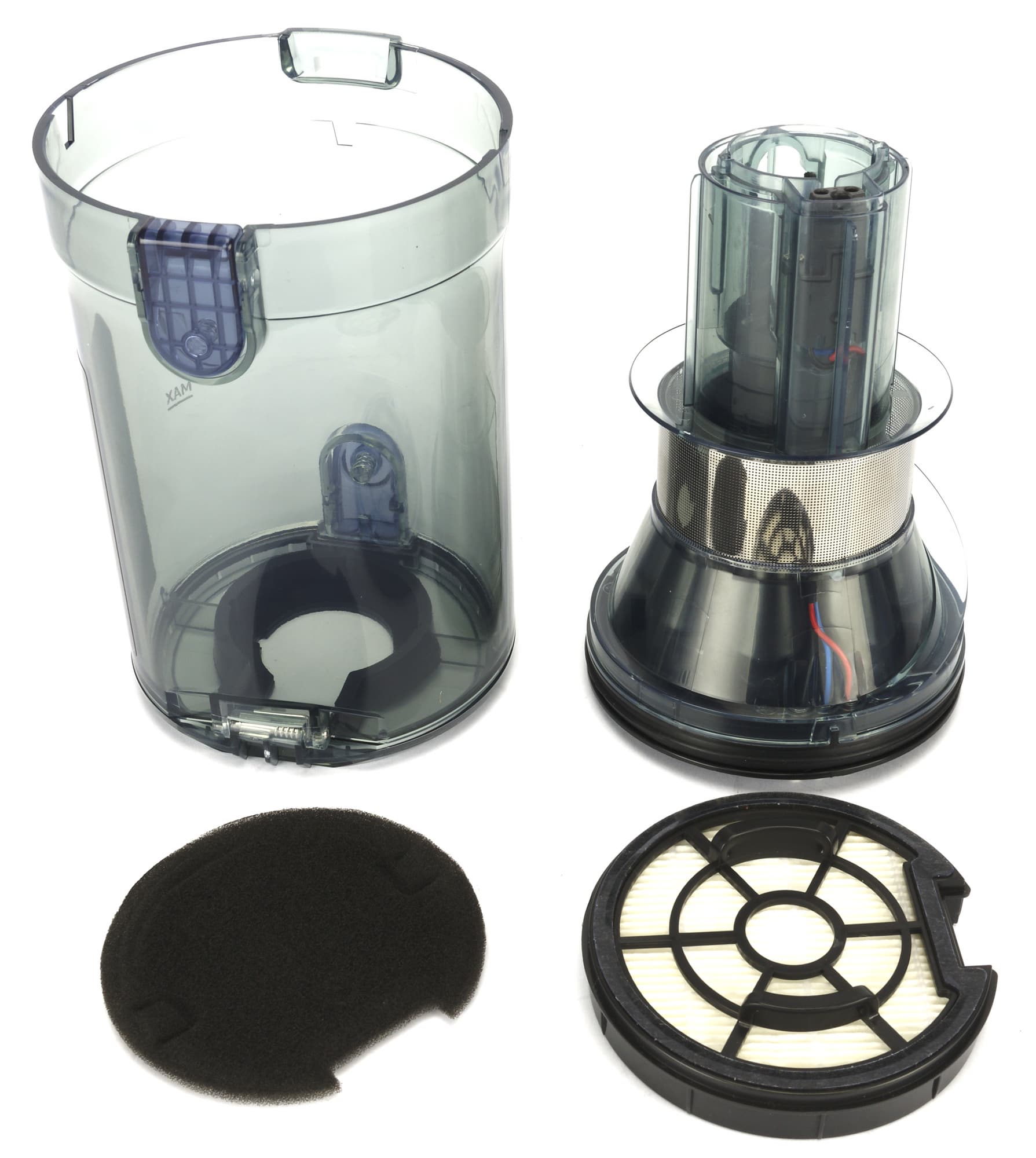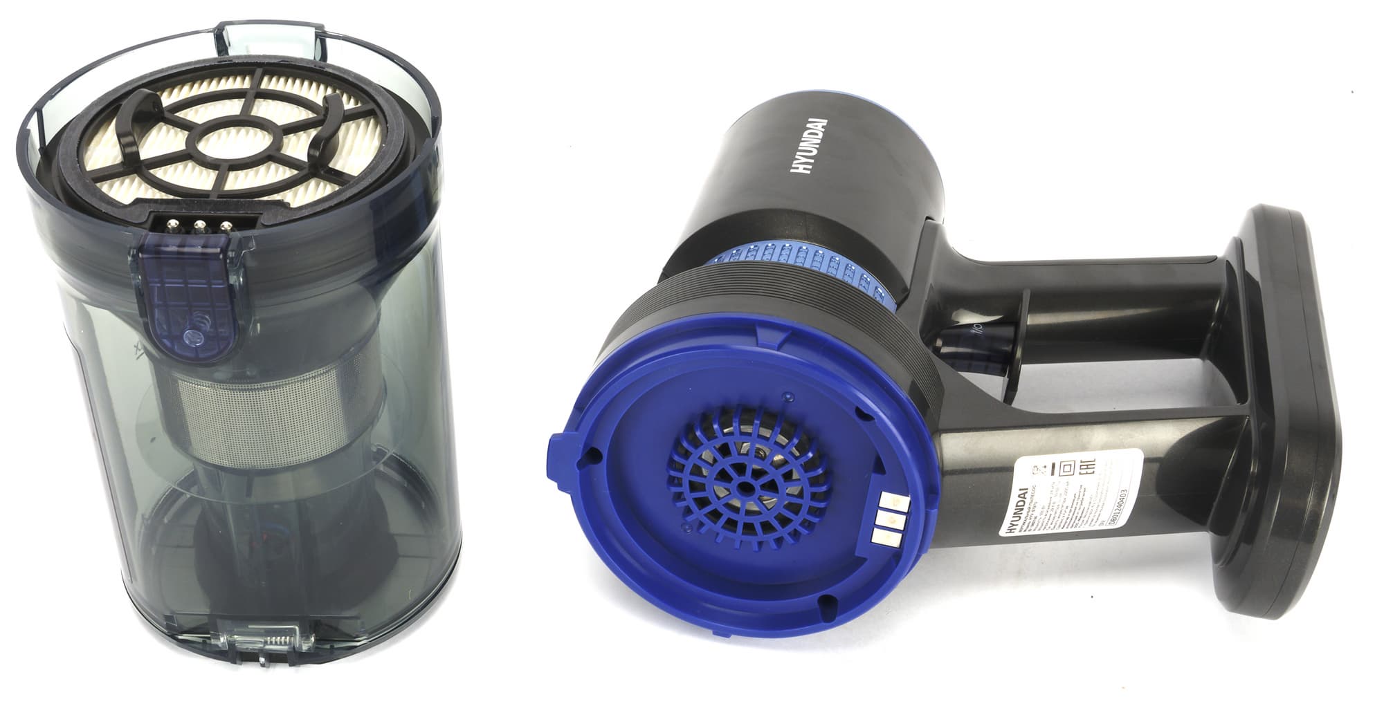 Провода от контактов проходят внутри прозрачного неразборного циклонного элемента и заканчиваются розеткой воздушного тракта. Поток воздуха с пылью и мусором поступает в контейнер, закручивается вокруг циклона и разделяется по фракциям: крупные и тяжелые фрагменты остаются в стакане, а пыль среднего размера оседает на стальной решетке в центральной части. Затем воздух проходит через предварительный фильтр из черного поролона и, наконец, достигает элемента тонкой очистки — дискового HEPA класса H13.