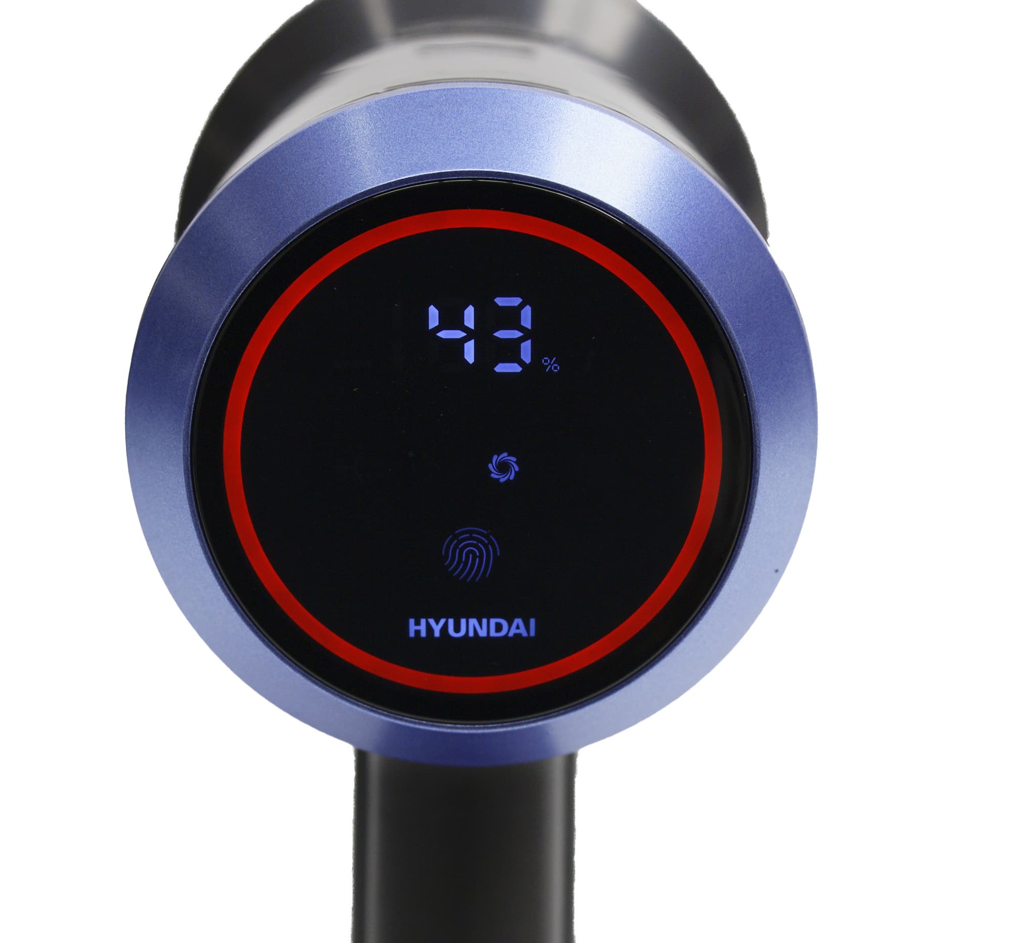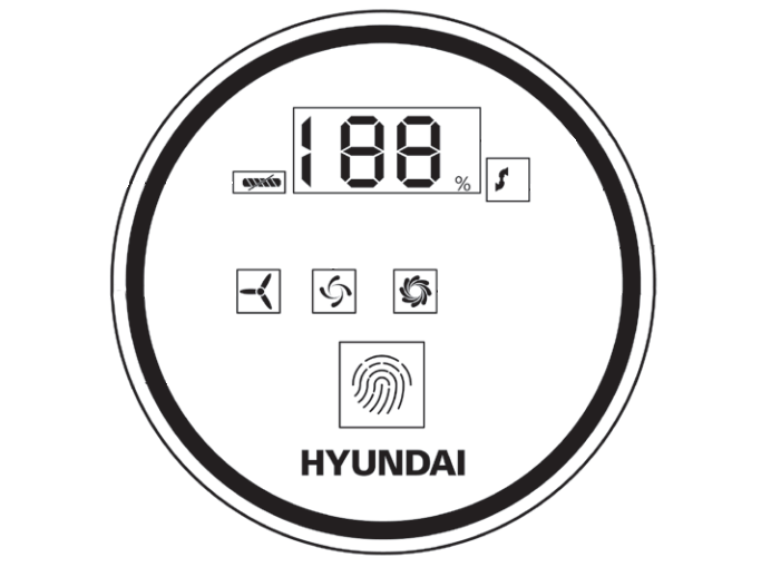 На цифровом экране отображается текущий уровень заряда аккумулятора в процентах. Выбранная мощность обозначается символом под цифрами. Пылесос включается на минимальном уровне, а последовательными нажатиями на сенсор с изображением отпечатка пальцев обороты можно переключить на средние и максимальные.