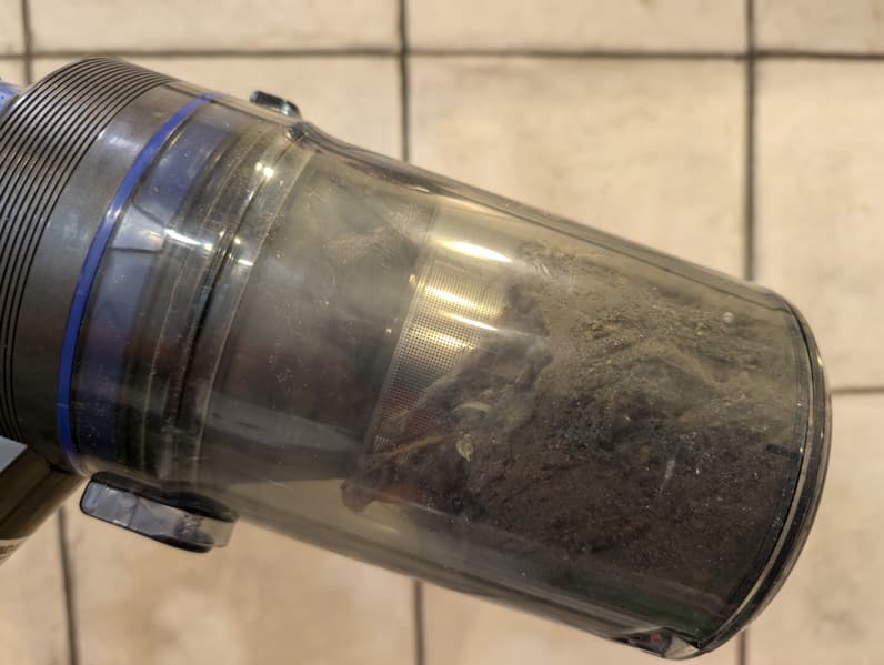 Выступ внутри циклона, в котором проходит провод питания щетки, уменьшает полезное пространство и может служить бутылочным горлышком, где скапливается мусор. Образующаяся пробка снижает эффективность циклонного фильтра: за это мы снижаем один балл при оценке качества фильтрации.