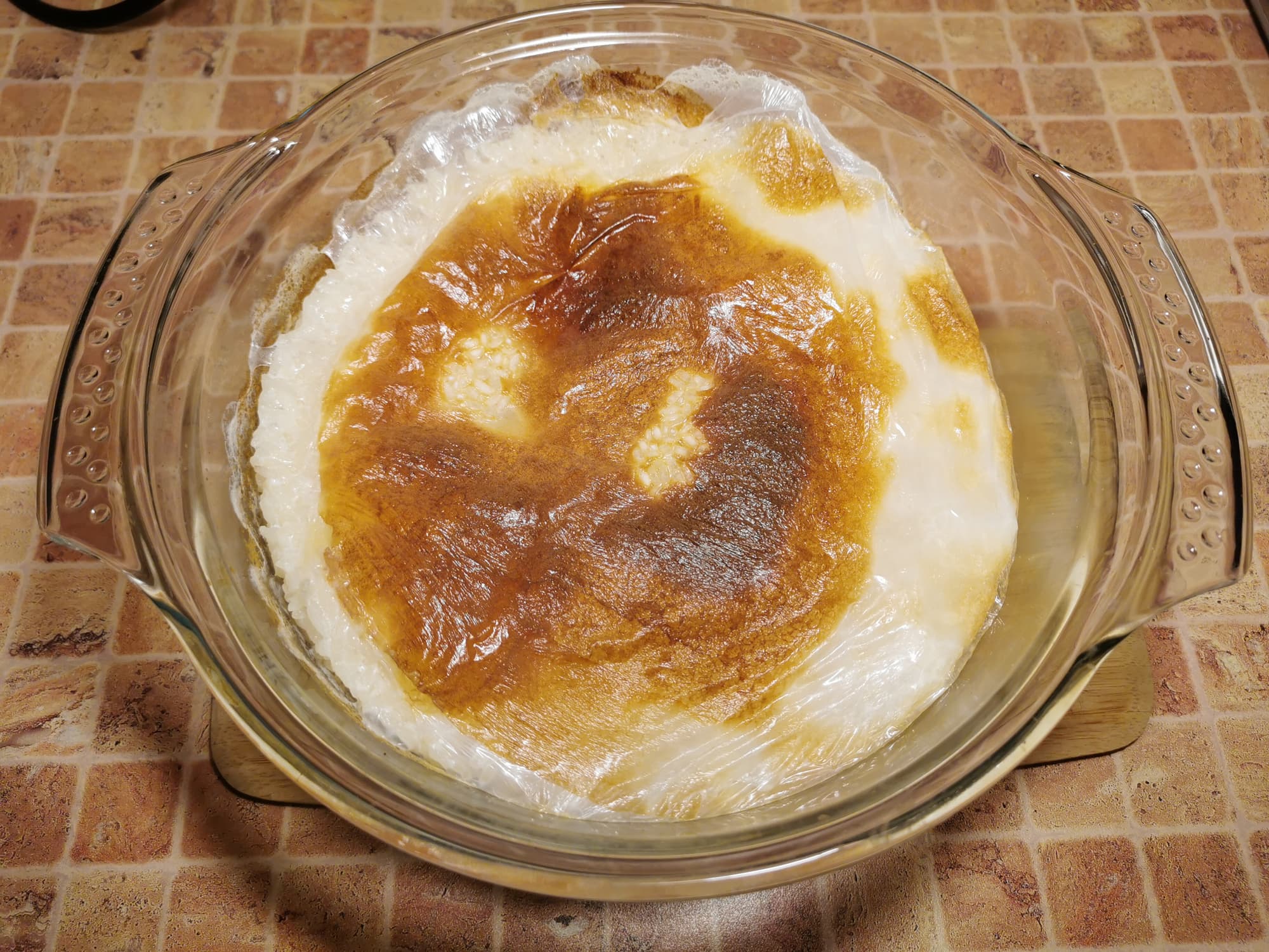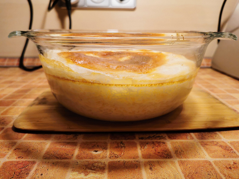 Когда молоко практически выпарилось мы снизили температуру в печке до 150 °C и оставили кашу томиться еще на 5 минут.