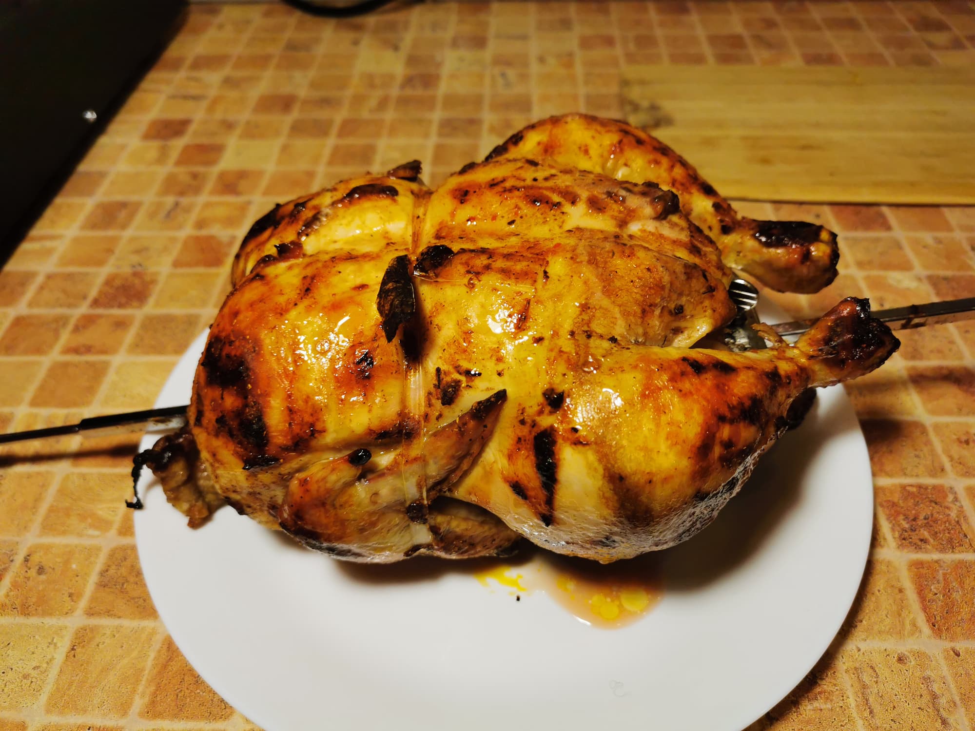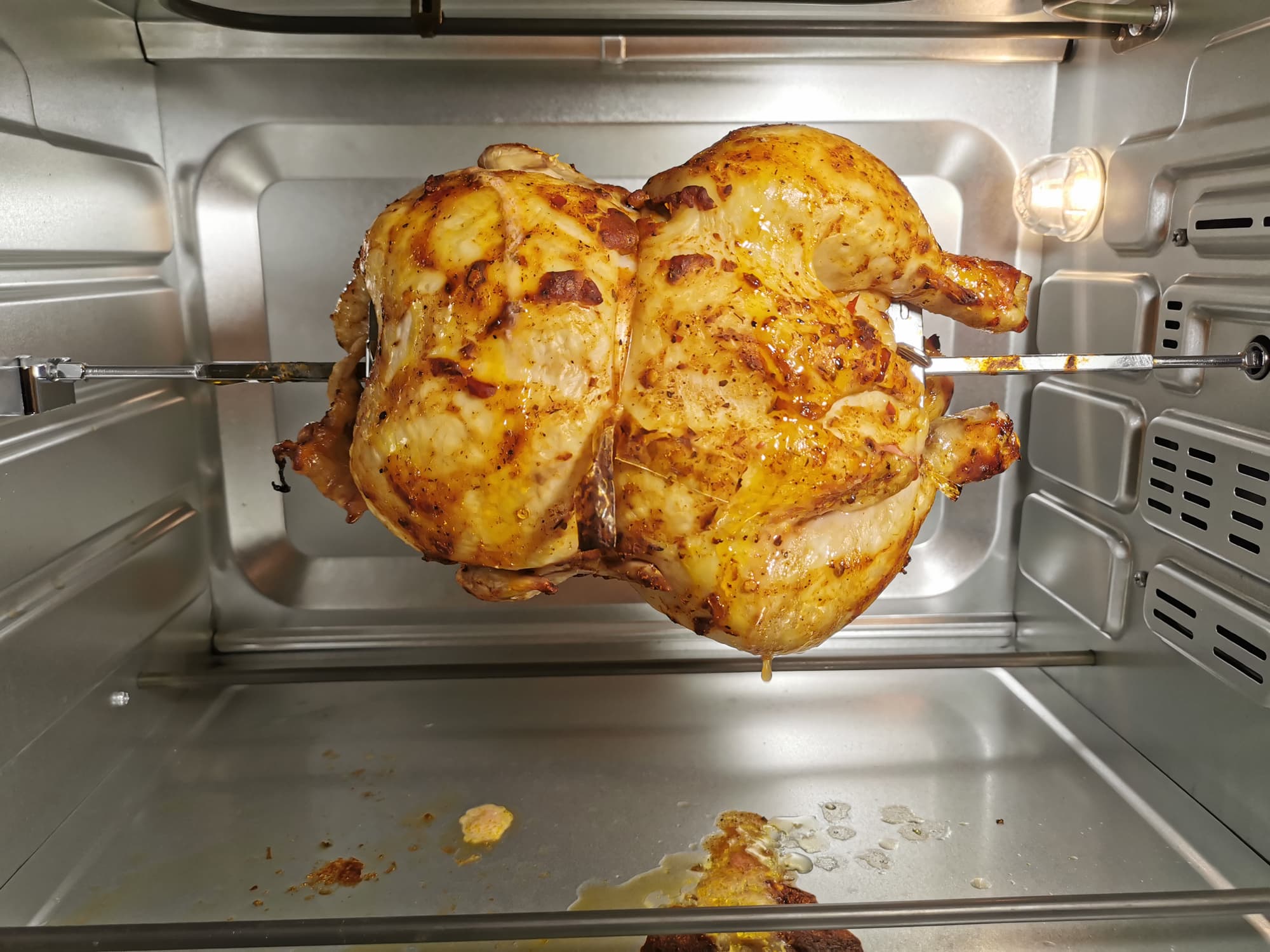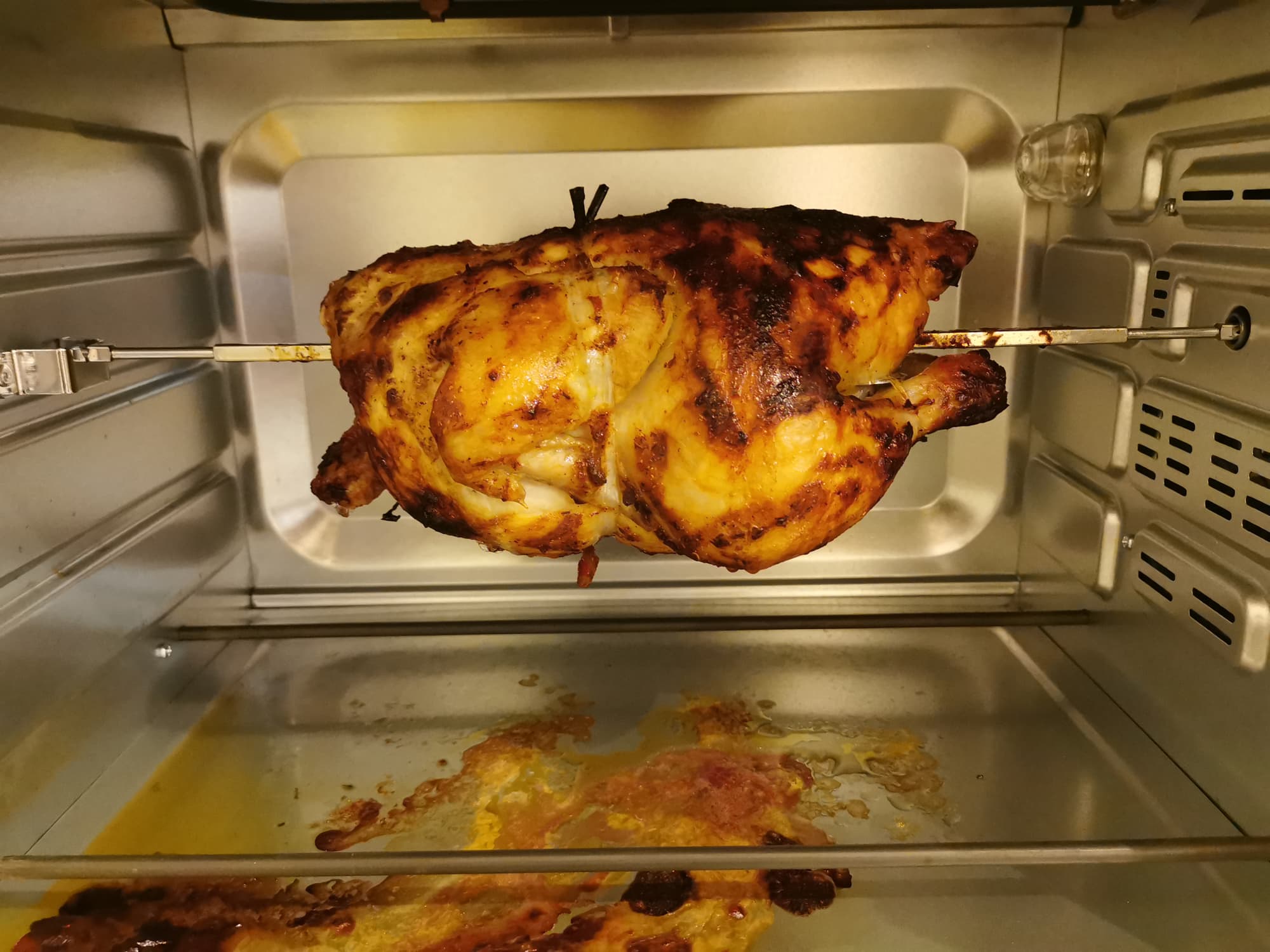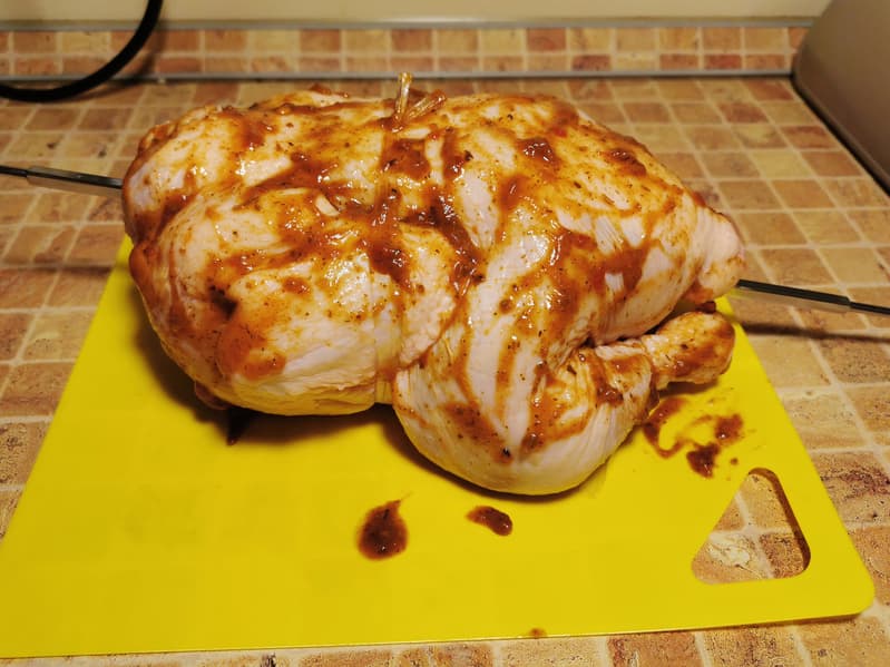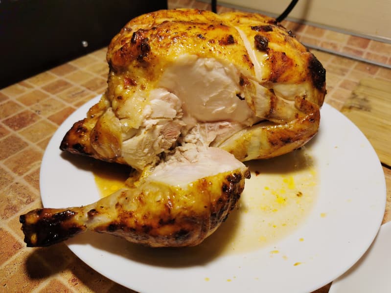 Для теста вертела и режима верх+низ+конвекция+вертел мы решили приготовить курицу-гриль.
