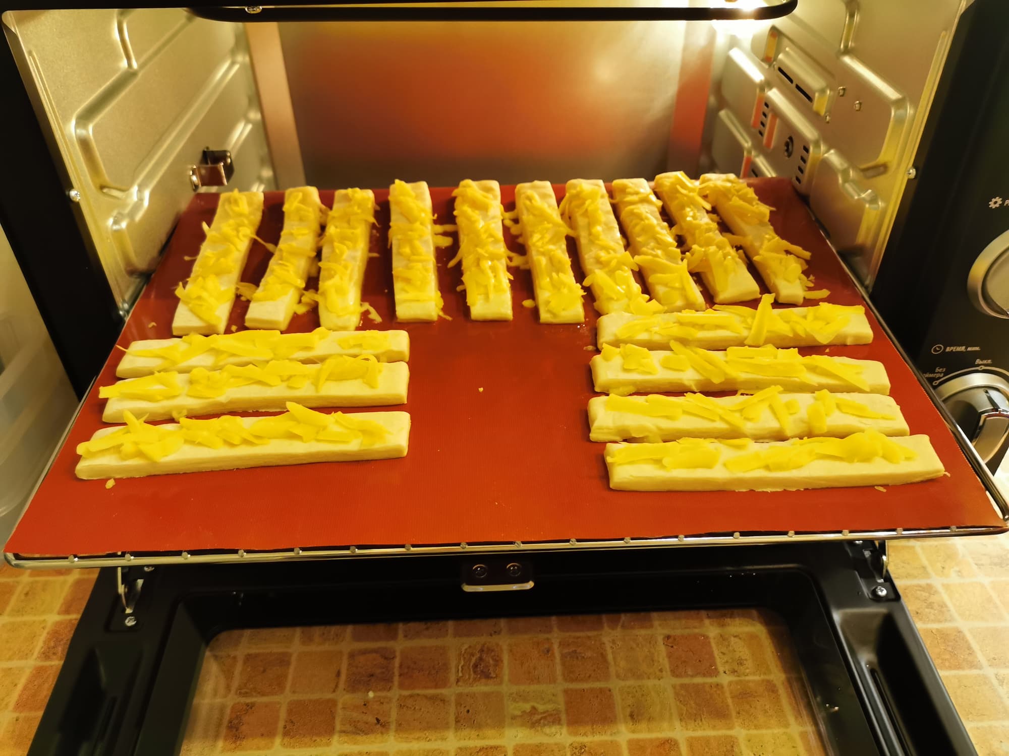 Тесто мы нарезали полосками, выложили его на противень, посыпали сыром и отправили в разогретую до 190 °C печку.
