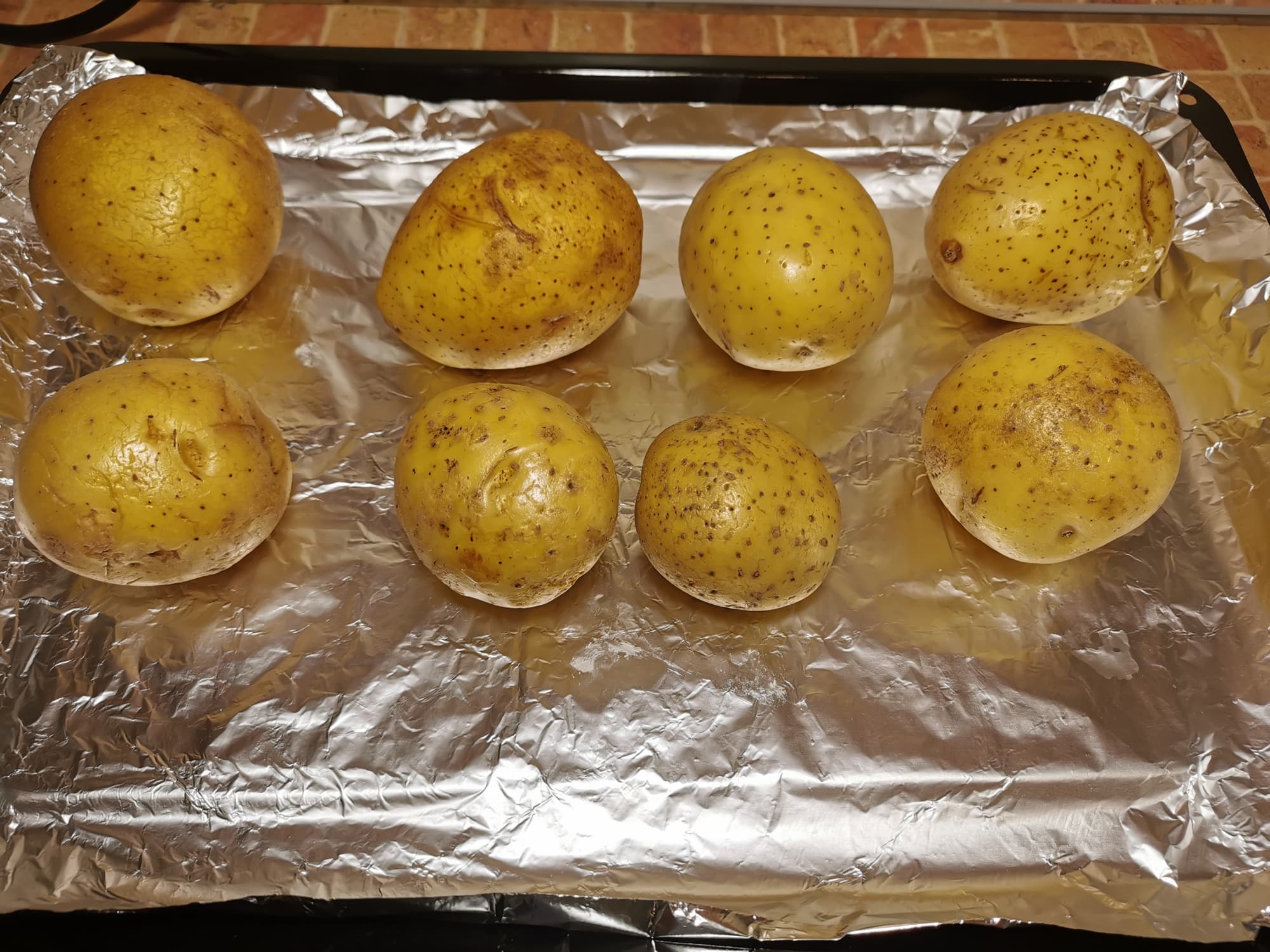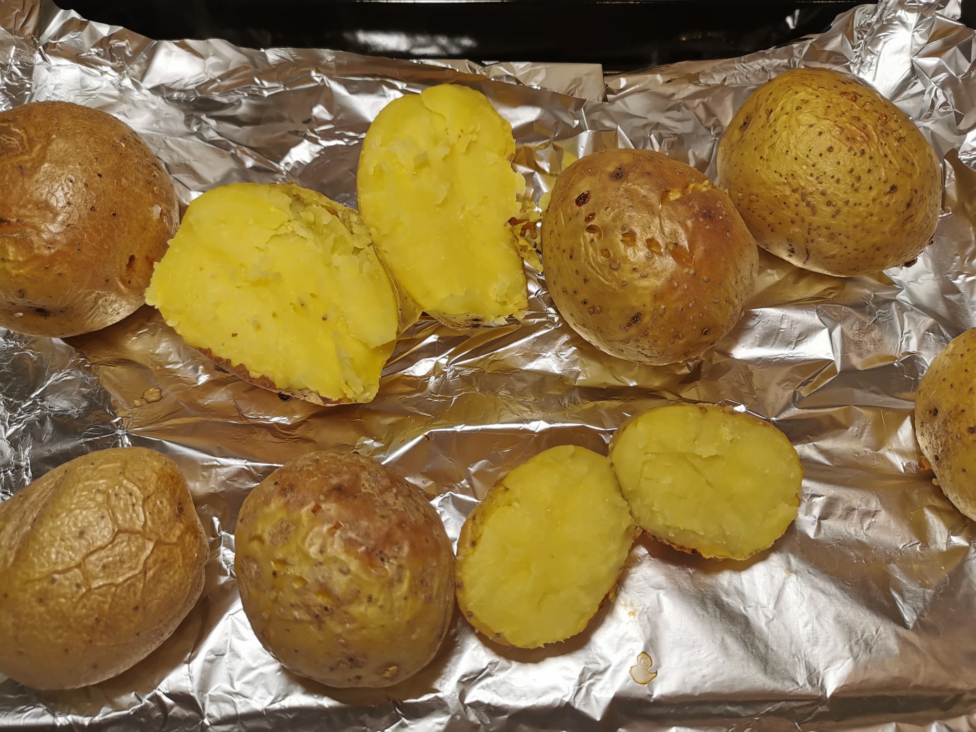 Для этого нам потребовалось несколько тщательно помытых молодых картофелин и фольга, которую мы выложили на противень.