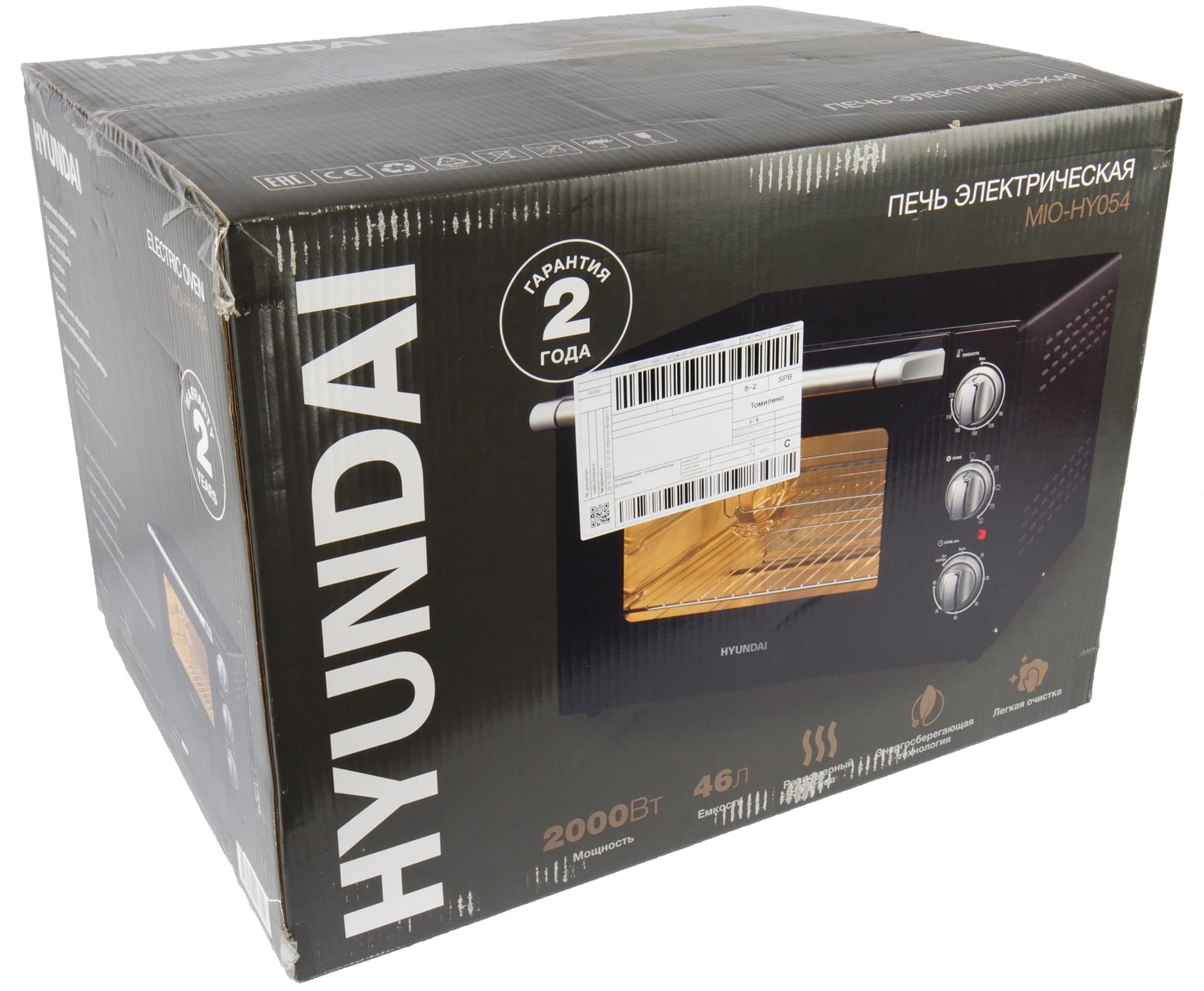 Печь приехала к нам в крупной черной коробке без ручек. На лицевой и задней стороне находится фотография самого устройства, указан бренд, модель и нанесены пиктограммы с его основными техническими особенностями. По бокам на коробке указана краткая информация со сведениями об устройстве и условиях его перевозки.