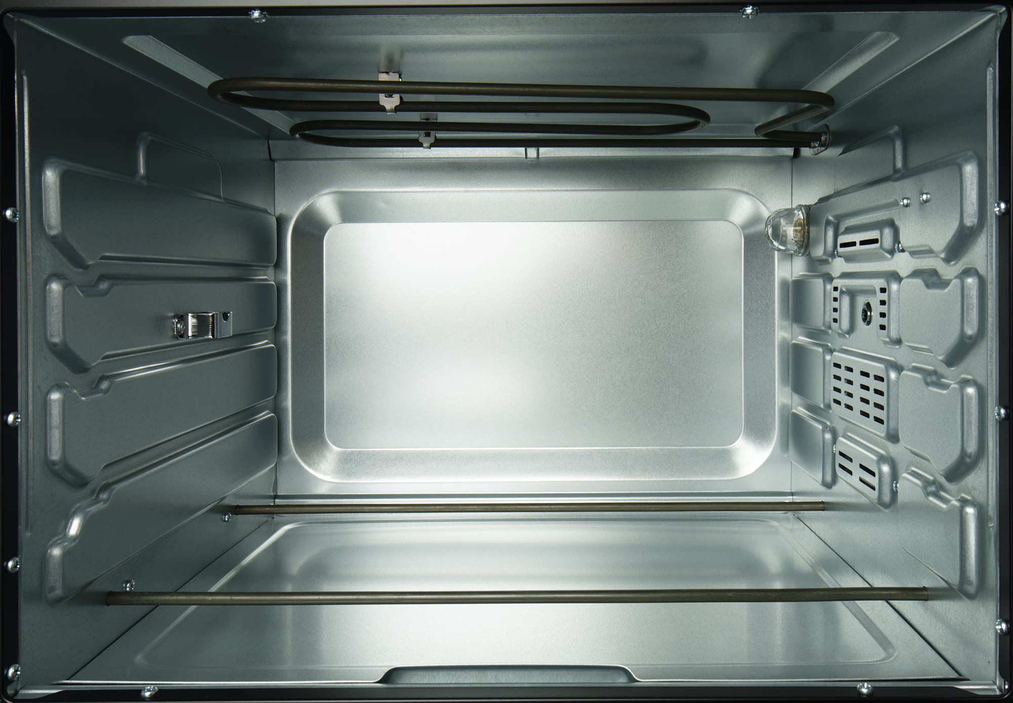 Внутренняя часть камеры выполнена из нержавеющей стали. Сверху камеры расположен тэн гриля, справа находятся отверстия для циркуляции воздуха (так реализована работа конвекции и охлаждение прибора) и лампа освещения, внизу также располагаются два тэна.
