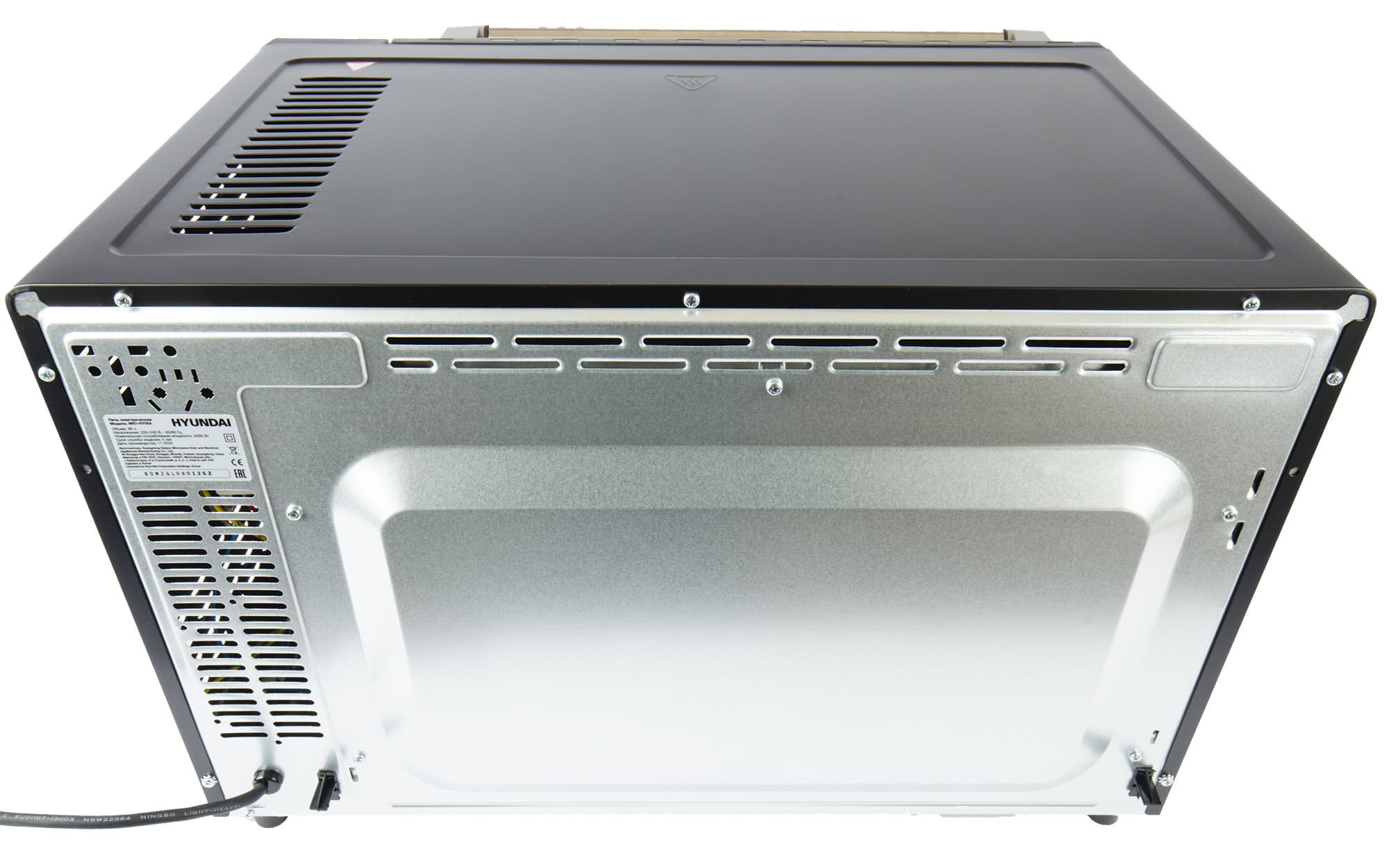 На тыльной стороне мы видим также вентиляционные и технические отверстия, вывод шнура, выгнутый защитный экран и наклейку с краткой технической информацией об устройстве.