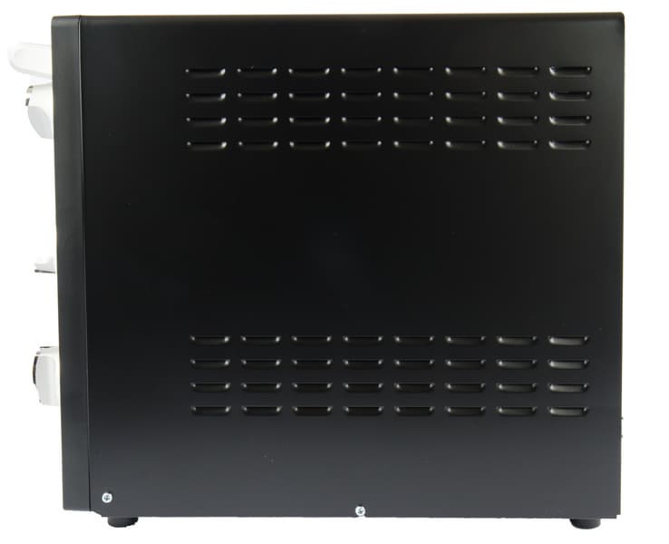 Во время работы печи мы также измерили температуру ее поверхностей, чтобы установить, насколько они нагреваются. Дверца и стекло в ней в среднем нагреваются до 75—88 °C, ручка на дверце и поворотные ручки-регуляторы практически не нагреваются, боковые стороны печи нагреваются до 55 °C, сверху максимальный зафиксированный нами нагрев составил 87 °C. Опираясь на данные показания, смело можем утверждать, что печь следует устанавливать в специально заготовленное для нее место на кухне, не давая ей соприкасаться с мебелью и прочими приборами, оставляя вокруг запас свободного пространства в 5-10 см.