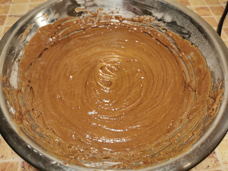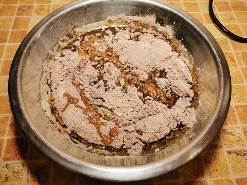 Для выпечки мы взяли готовую смесь для шоколадного кекса, растопили 80 г сливочного масла и добавили 100 мл теплой воды.