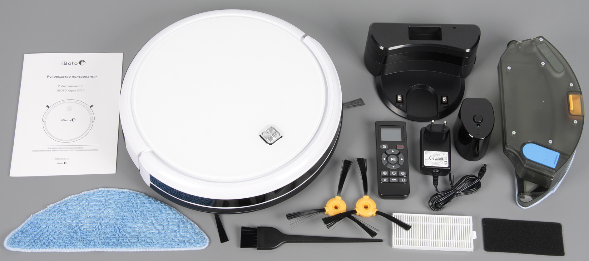 Робот-пылесос iBoto Aqua V710 упакован в картонную коробку белого цвета с небольшой наклейкой, объясняющей, что же в коробке находится. Коробка не очень большая и оснащена пластиковой ручкой, поэтому донести покупку до дома будет нетрудно. В комплект поставки входят почти все необходимые для работы аксессуары, почти, так как элементы питания типа AAA для пульта и типа АА для виртуальной стены пользователю придется покупать дополнительно. Запасные части и расходные материалы в комплекте представлены сменным складчатым и поролоновым фильтрами, парой салфеток из микроволокна и двумя боковыми щеточками.