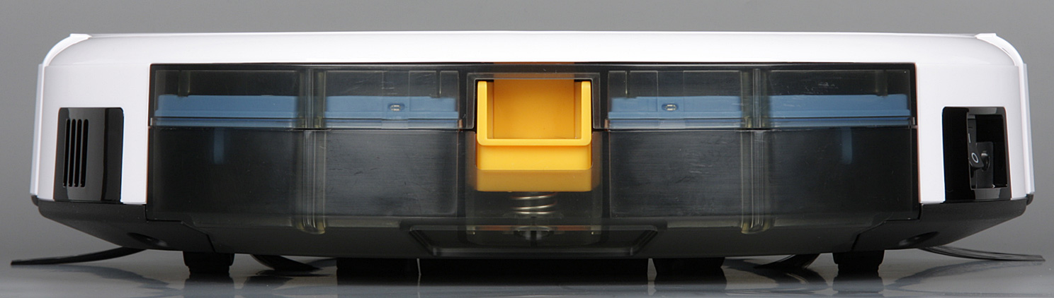 Выраженный бортик сверху на бампере снижает вероятность того, что робот застрянет под низкими предметами обстановки, например, под диваном. Сдвиг бампера вызывает срабатывание механических датчиков препятствий. Для защиты мебели спереди на бампер в нижней его части наклеена полоса из резины средней жесткости. Выше на бампере за окошком из тонированного пластика находятся ИК-датчики обнаружения препятствий, базовой станции и, возможно, приемник команд с пульта ДУ. Что-то из перечисленного, видимо, также расположено за тонированными окошками на корпусе за бампером ближе к задней части пылесоса. Нажав на желтый фиксатор сзади, можно отсоединить пылесборник от корпуса робота.