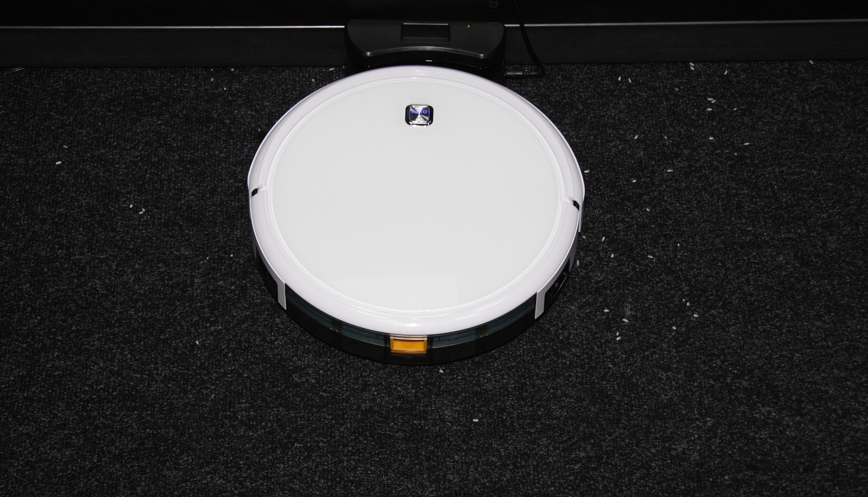 Загон шире робота всего на 5 см, но это не помешало роботу заехать туда несколько раз. Робот объезжает базу с запасом по расстоянию, поэтому не толкает ее и не сдвигает с места, однако и мусора около базы остается относительно много. Между высокими вертикальными и хорошо отражающими ИК-лучи стенками и корпусом робота обычно остается небольшой зазор, тогда как к низким, наклонным (например, к плинтусу) или черным в ИК-свете стенкам робот подъезжает вплоть до срабатывания механического датчика в бампере. Почти полностью разрядив аккумулятор, робот выключает вентилятор, снижает скорость движения и скорость вращения боковыми щеточками и начинает искать базу. Видео ниже это демонстрирует:
