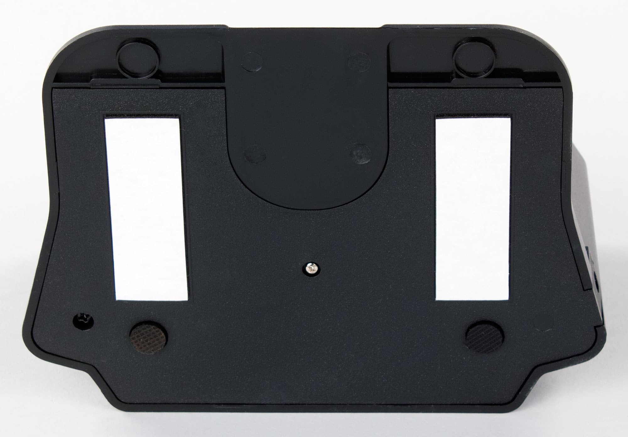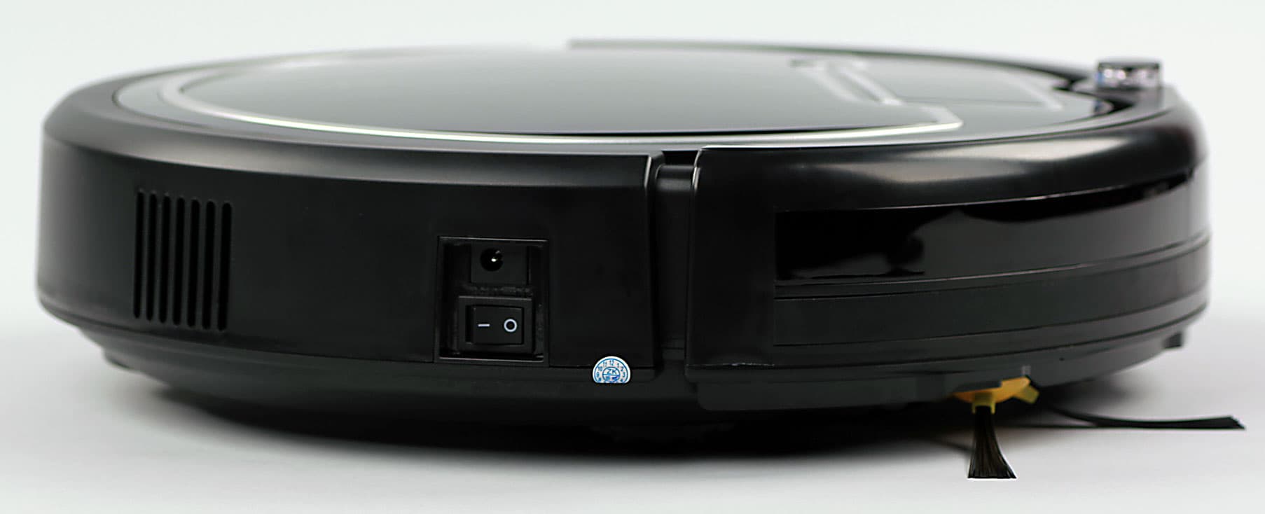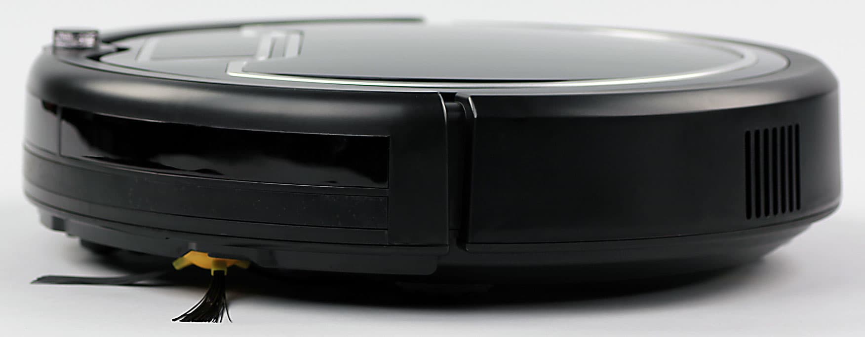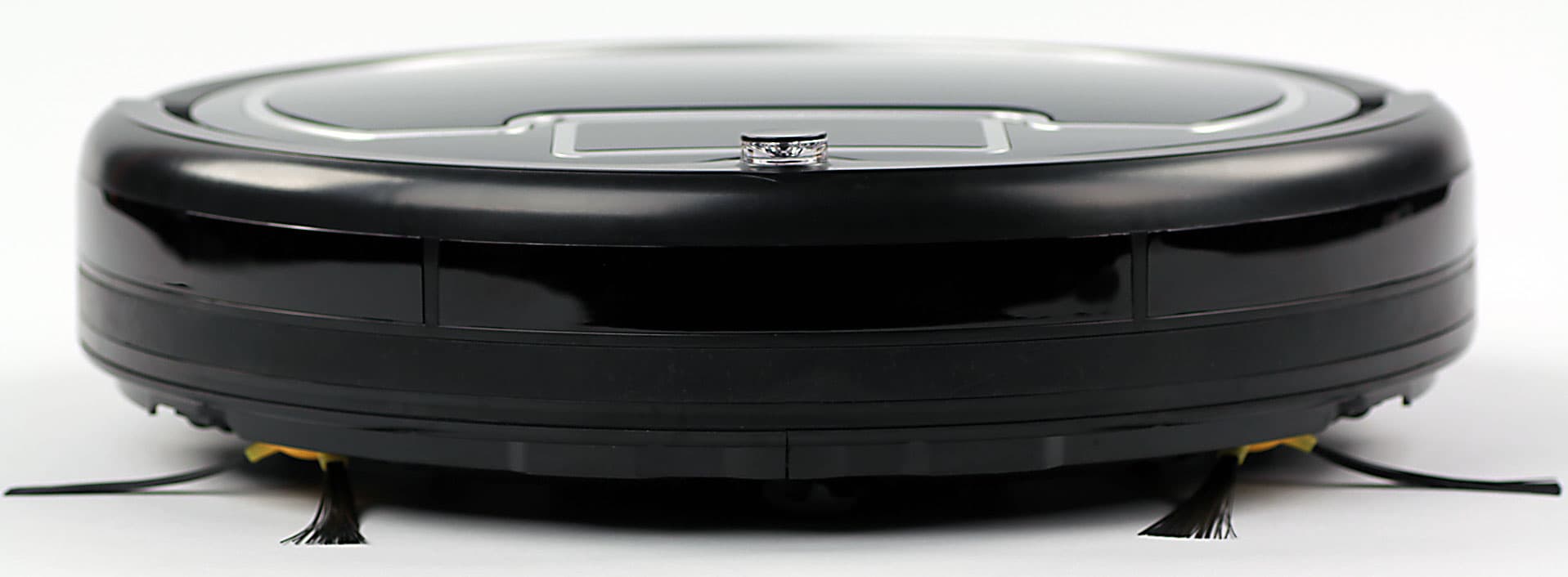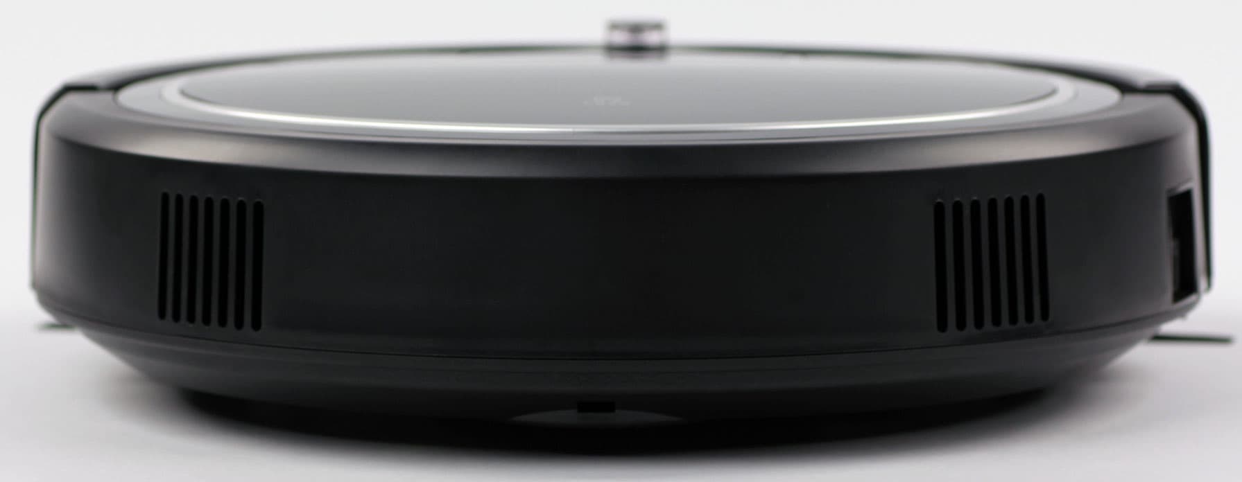 Для защиты мебели спереди на бампер наклеена резиновая полоса. Сверху в передней части бампера есть небольшой выступ ИК-датчика, который является самой высокой частью пылесоса и определяет минимальный просвет препятствия (например, дивана), под которое пылесос еще может забраться.