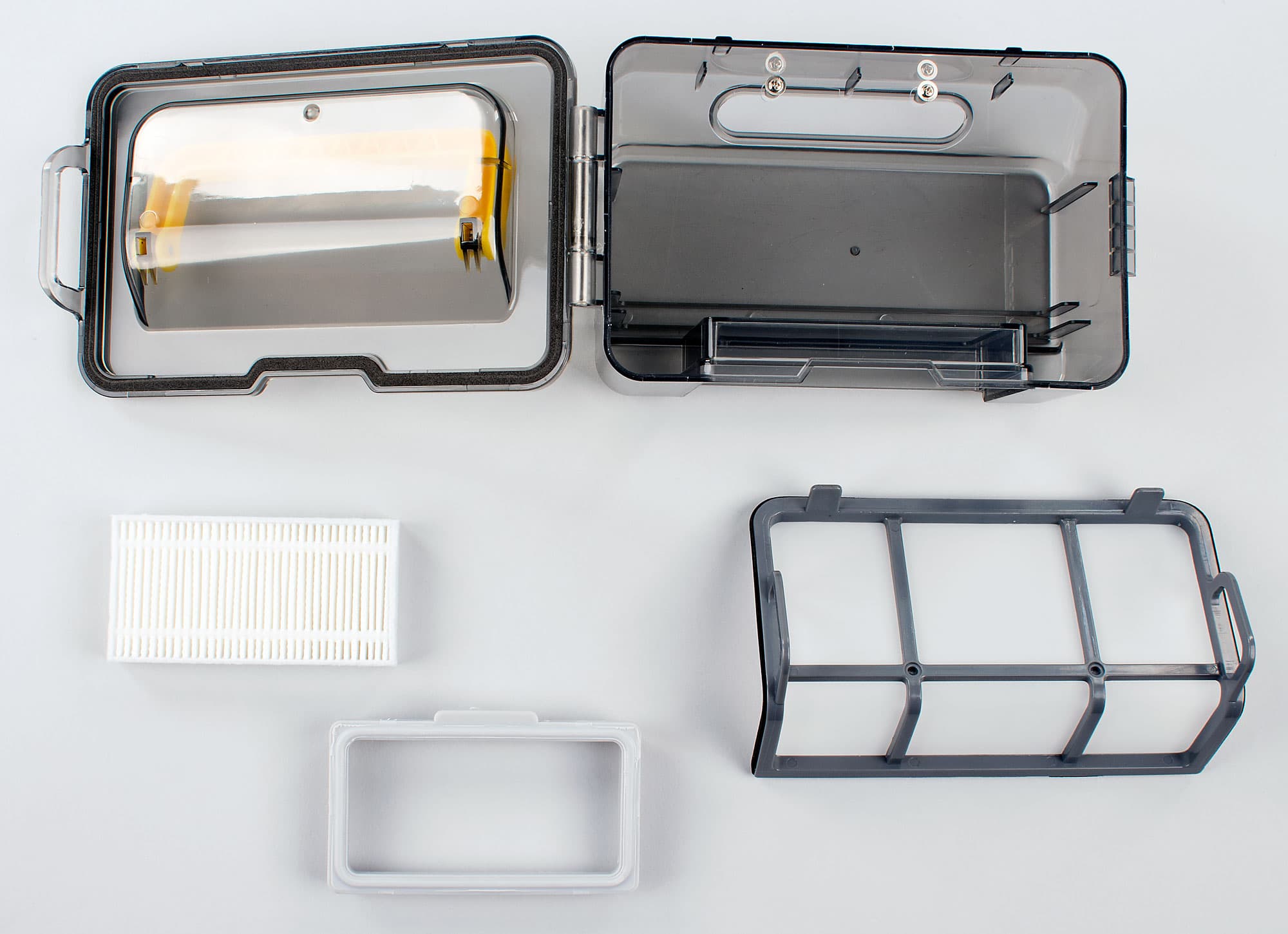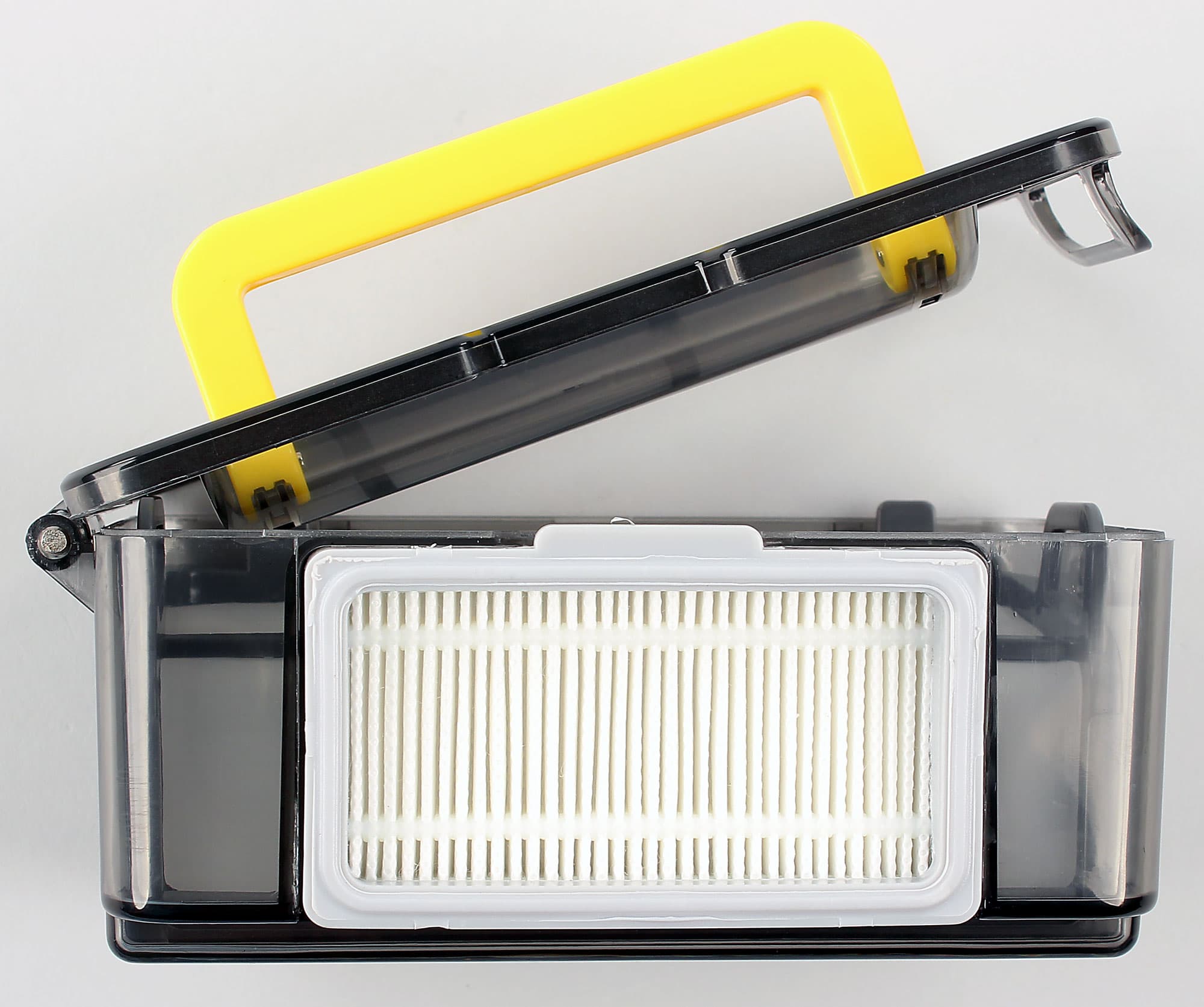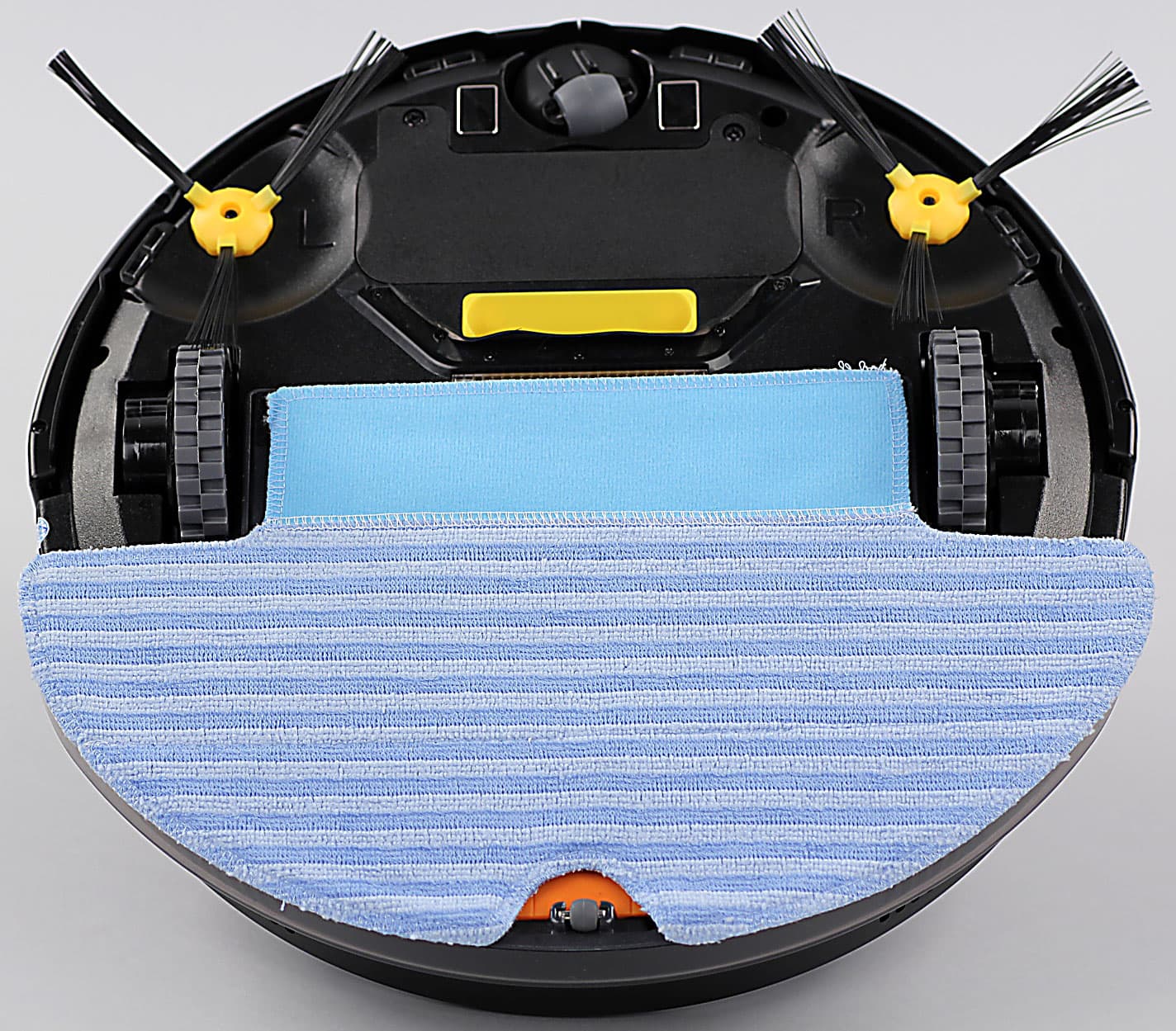 При уборке две передние щеточки подгребают мусор к центру, затем частички мусора через патрубок на днище потоком воздуха засасываются в пылесборник, где задерживаются сетчатым фильтром, а мельчайшие пылинки остаются на втором складчатом фильтре. Для дополнительной очистки гладких полов на днище робота можно закрепить специальную насадку, к которой на липучке прикрепляется махровая салфетка.