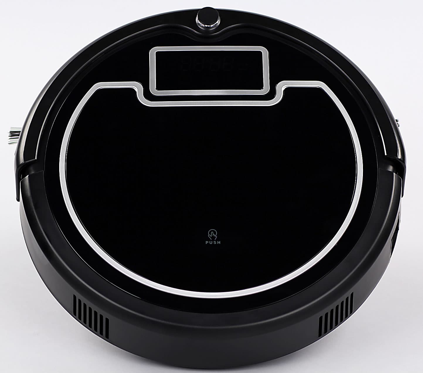 На верхней панели ближе к передней части корпуса находится контрольная панель с четырьмя ёмкостными сенсорными кнопками, подсвечиваемыми светодиодами значками режимов и состояния, а также сегментным светодиодным индикатором. Свечение значков и индикатора синее и неяркое, поэтому издалека и в светлом помещении рассмотреть что-либо на контрольной панели практически невозможно. Дополнительно о своем состоянии робот информирует с помощью звуковых сигналов и речевых сообщение на неразборчивом английском с выраженным китайским акцентом. Отключить звуковое оповещение нельзя. Нажав с усилием на значок с надписью PUSH (нажми), можно открыть крышку отсека пылесборника. Вынимается сам пылесборник за желтую ручку, а для его опустошения нужно отщелкнуть крышку, вынуть предварительный сетчатый фильтр и вытряхнуть собранный мусор из емкости.