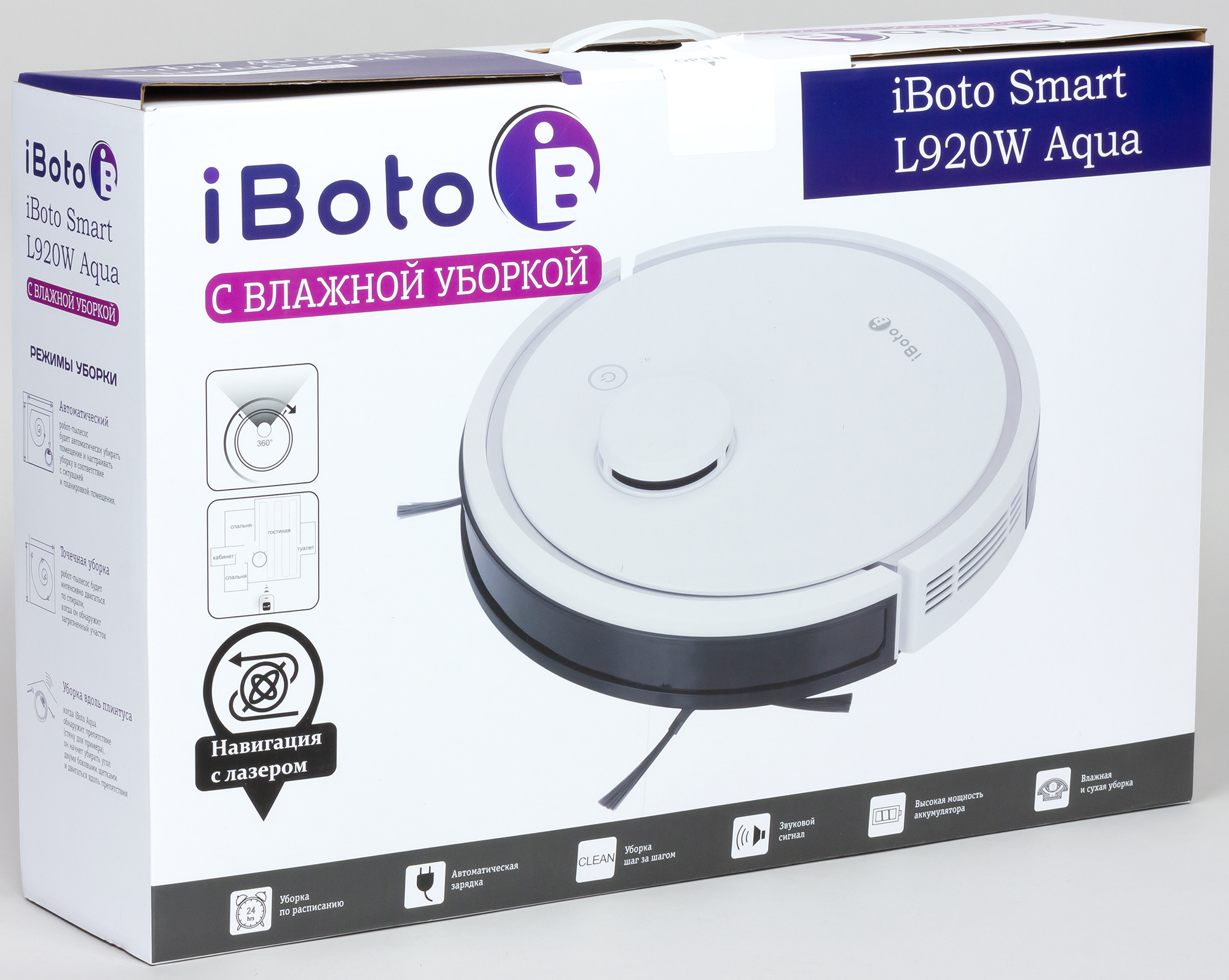 Робот-пылесос iBoto Smart L920W Aqua убирает быстро и качественно. Это достигается за счет высокой эффективности сбора мусора с пола и продвинутой навигации, благодаря которой робот реже проезжает по уже убранным местам и не оставляет неубранные участки на доступной ему площади. Робот умеет протирать гладкие полы, для чего в комплекте присутствует специальный блок с баком для воды. Используя приложение для мобильных устройств, пользователь получает доступ к дополнительным функциям, в том числе к регулировке мощности вентилятора, заданию расписания уборки и интервала режима «не беспокоить», а также к возможности задания зон на карте, где роботу появляться запрещено.
