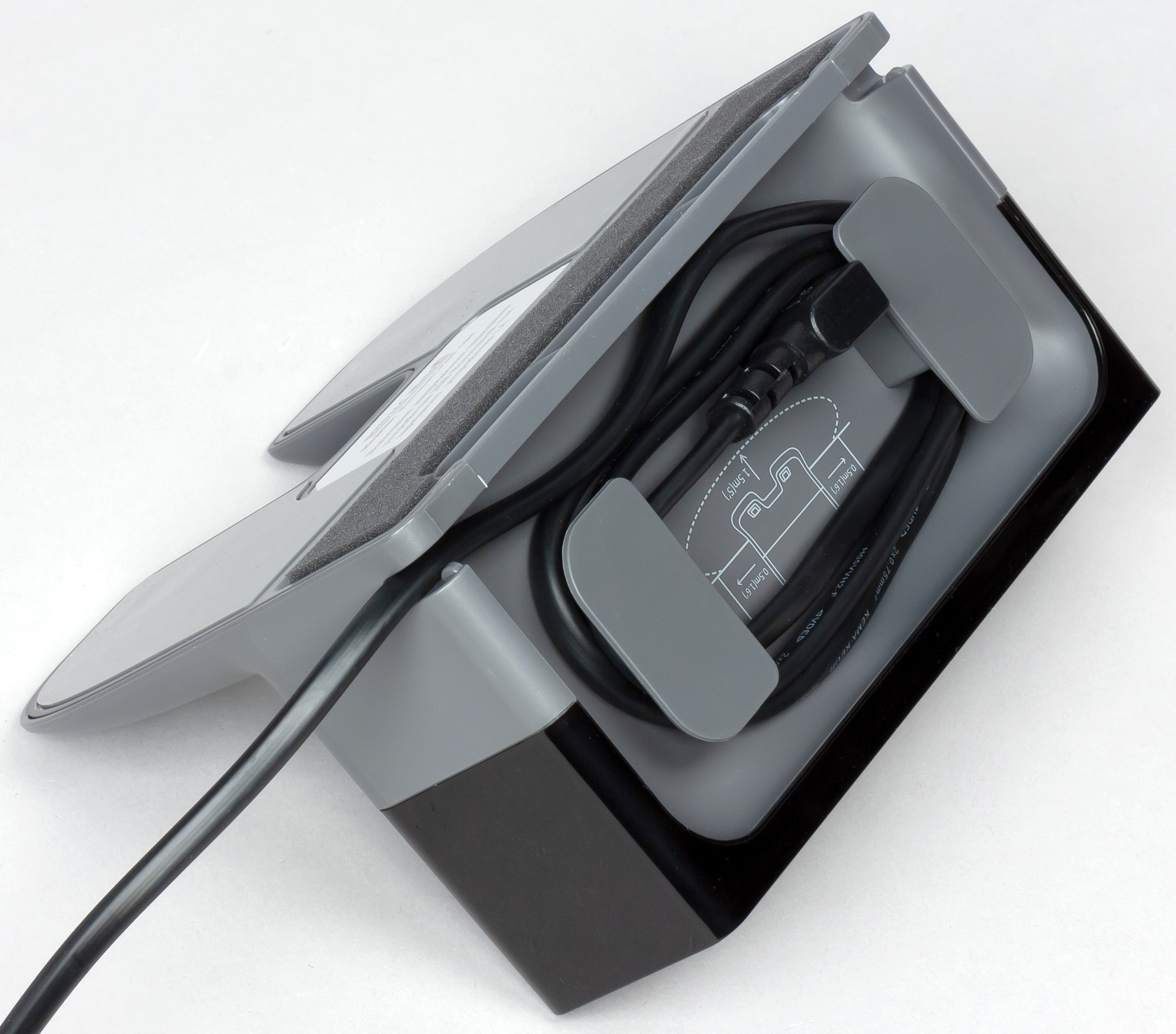 Снизу на основание наклеены три противоскользящие площадки — две резиновые, задерживающие базу на гладких поверхностях, и поролоновая, тормозящая базу на коврах. Излишки кабеля питания можно обмотать вокруг двух зацепов сзади на базе, а вывести его можно через пазы справа или слева. Длина кабеля питания равна 1,8 м.