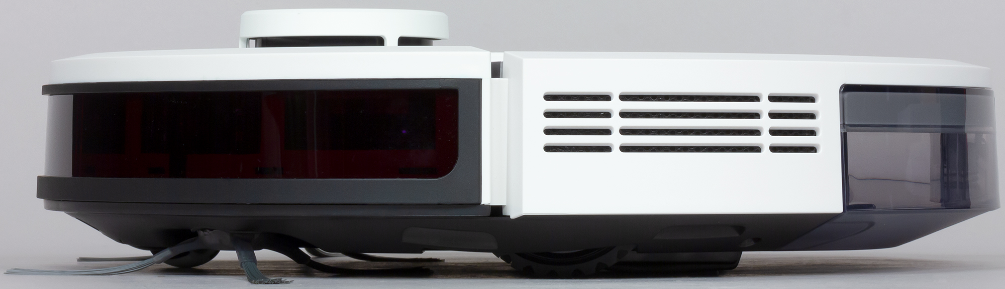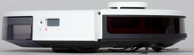 Края сзади снизу скошены, что помогает роботу преодолевать препятствия, а выраженный бортик сверху снижает вероятность того, что пылесос будет застревать под мебелью с небольшим просветом от пола. На правом боку расположены сдвижной переключатель питания, отключающий батарею от основных цепей робота, и кнопка сброса настроек подключения к Сети.