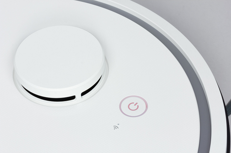 На верхней панели справа от башенки лидара находится механическая кнопка. Короткое нажатие на эту кнопку запускает или останавливает уборку, а длительное удерживание — заставляет робота вернуться на базу. Значок питания на кнопке и ободок вокруг нее подсвечиваются красным или белым, горят ровно или мигают в зависимости от состояния робота. Небольшой белый светодиодный индикатор, расположенный рядом со значком Wi-Fi, помогает понять текущее состояние подключения к сети.