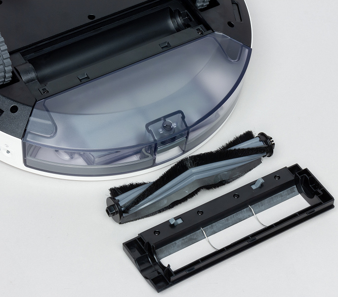 На днище расположены две контактные площадки, передний опорный поворотный ролик, боковые щеточки, два ведущих колеса, отсек основной щетки. Чтобы добраться до батарейного отсека, нужно снять нижнюю панель целиком. Ближе к краю находятся шесть ИК-датчиков перепада высоты, благодаря которым робот-пылесос может избежать падения со ступенек.