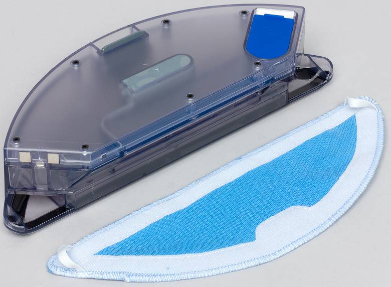 Салфетку можно предварительно увлажнить, а для поддержания ее во влажном состоянии, в бак нужно залить воду. Экспериментально определенный объем емкости для воды равен 330 мл. В горловине, которую закрывает силиконовая пробка, есть сетчатый фильтр. Жидкость на салфетку просачивается через отверстия в днище бака. Электрический клапан, установленный в блоке для влажной уборки, дозирует поступление воздуха в объем бака, что в свою очередь контролирует скорость вытекания воды. В процессе уборки нужно следить за уровнем воды, чтобы при необходимости долить воду в бак. В режиме влажной уборки основная и боковые щеточки вращаются, поэтому немного мусора забрасывается в крохотный отсек в передней части блока для влажной уборки. Перед зарядкой робота блок для влажной уборки нужно снять.