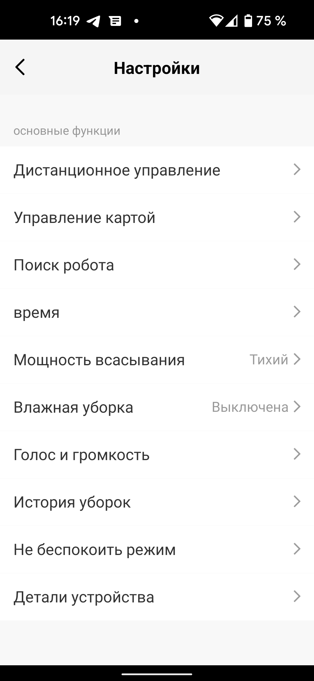 Страница настроек предоставляет множество дополнительных возможностей. Помимо управления картами и самим устройством здесь можно установить желаемую мощность всасывания, выбрать нужный голосовой пакет и запланировать расписание уборок.
