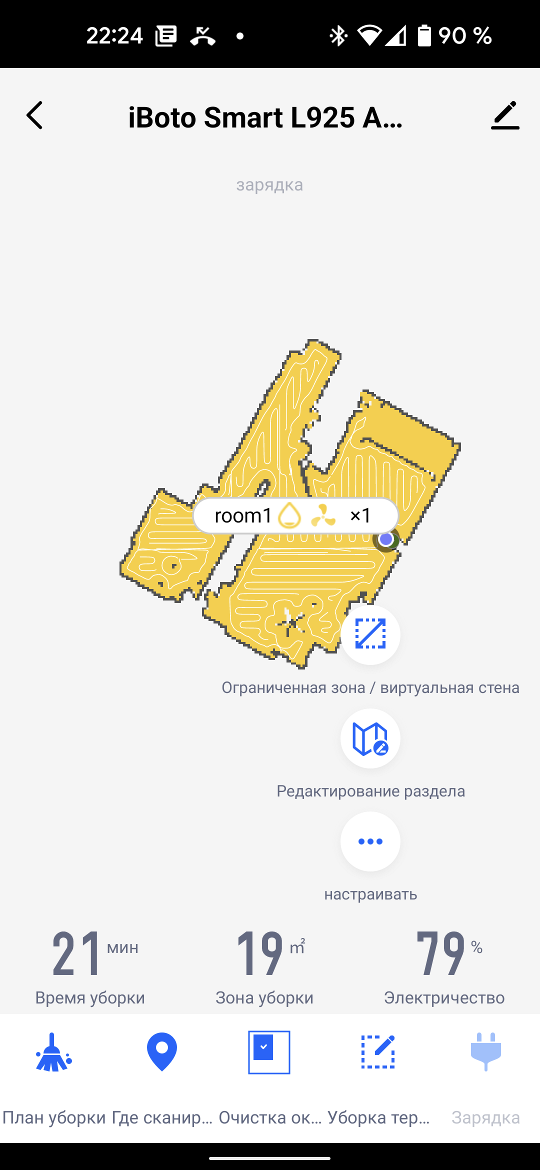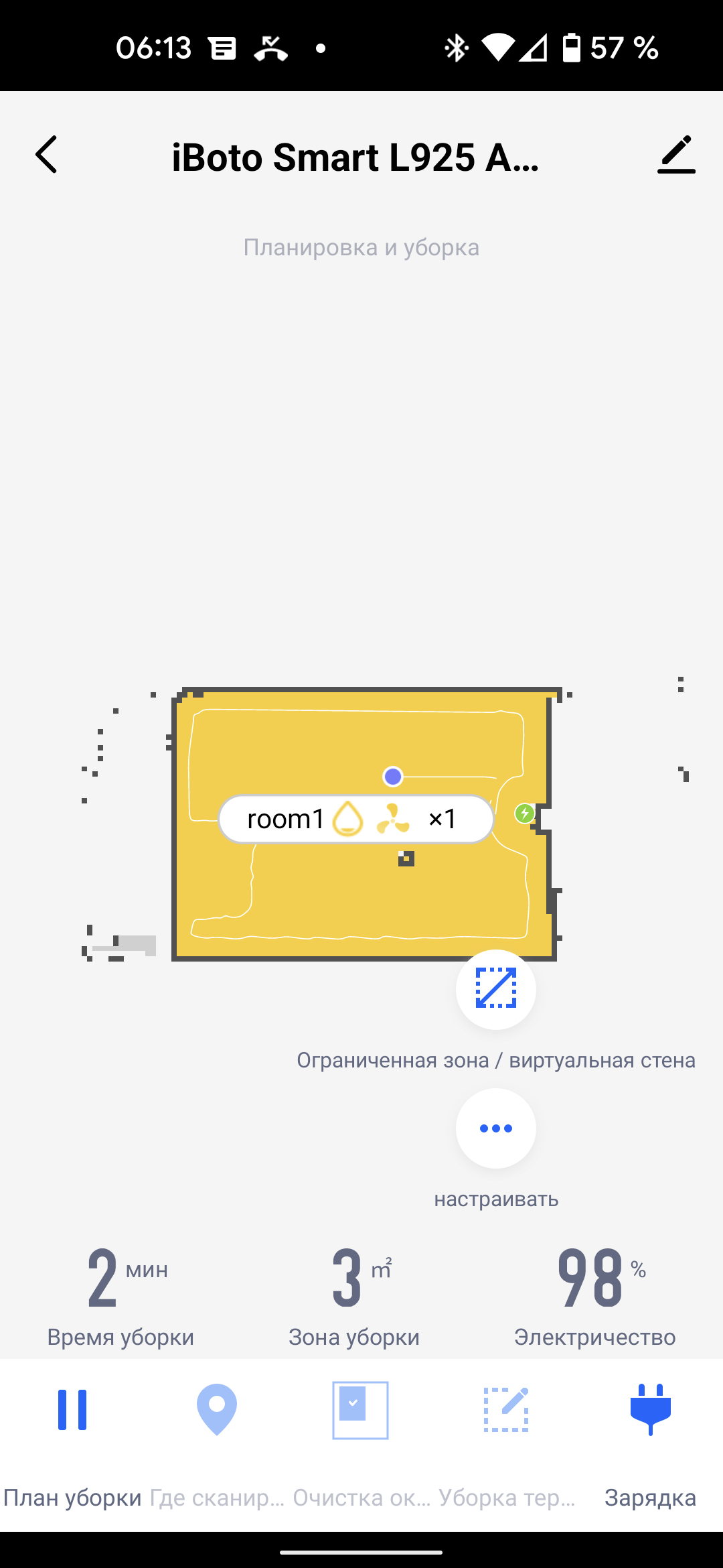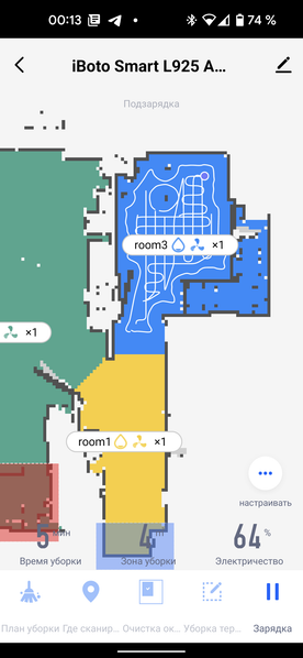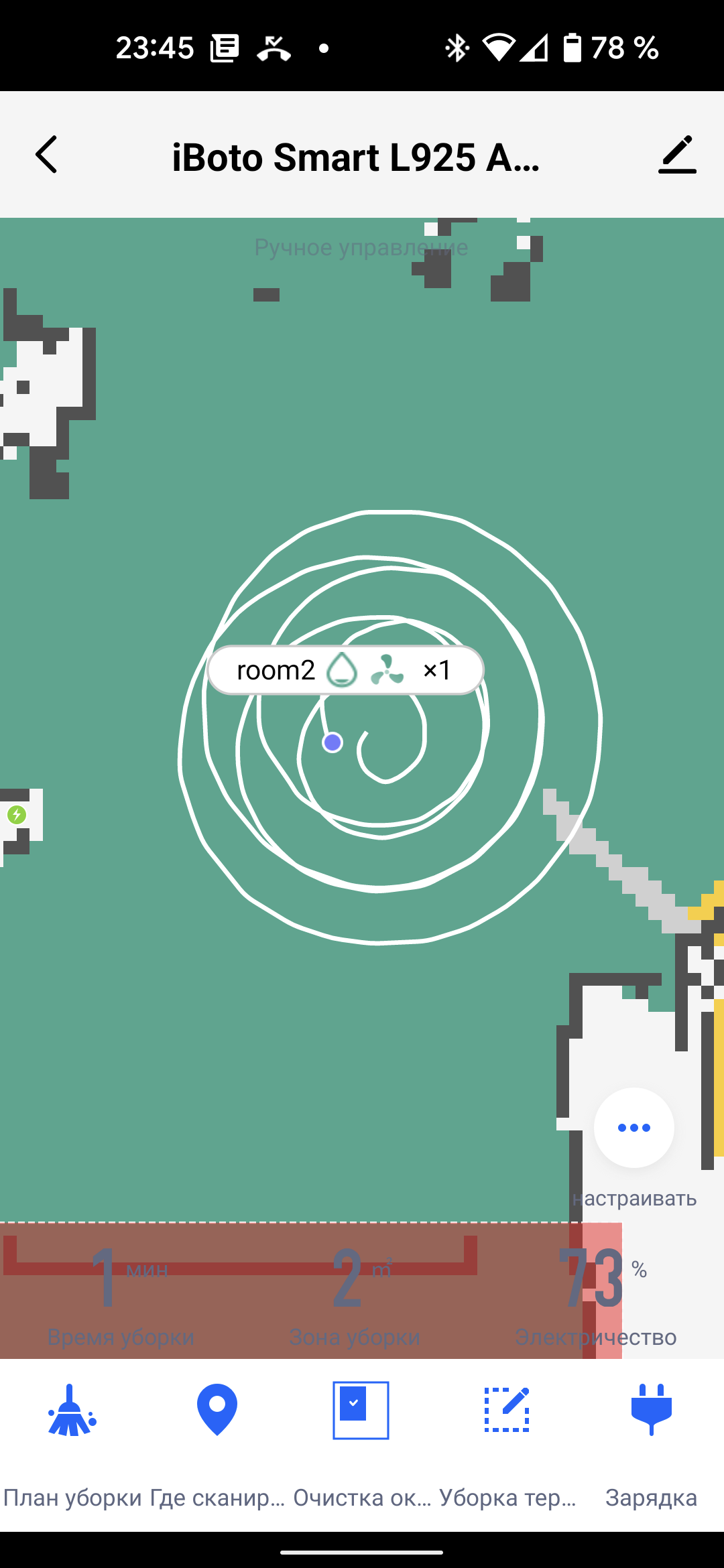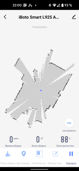 На главном экране приложения можно видеть карту помещения (как она выглядит с точки зрения робота), время текущей уборки, площадь, которую обошел прибор, и оставшийся процент заряда аккумулятора.