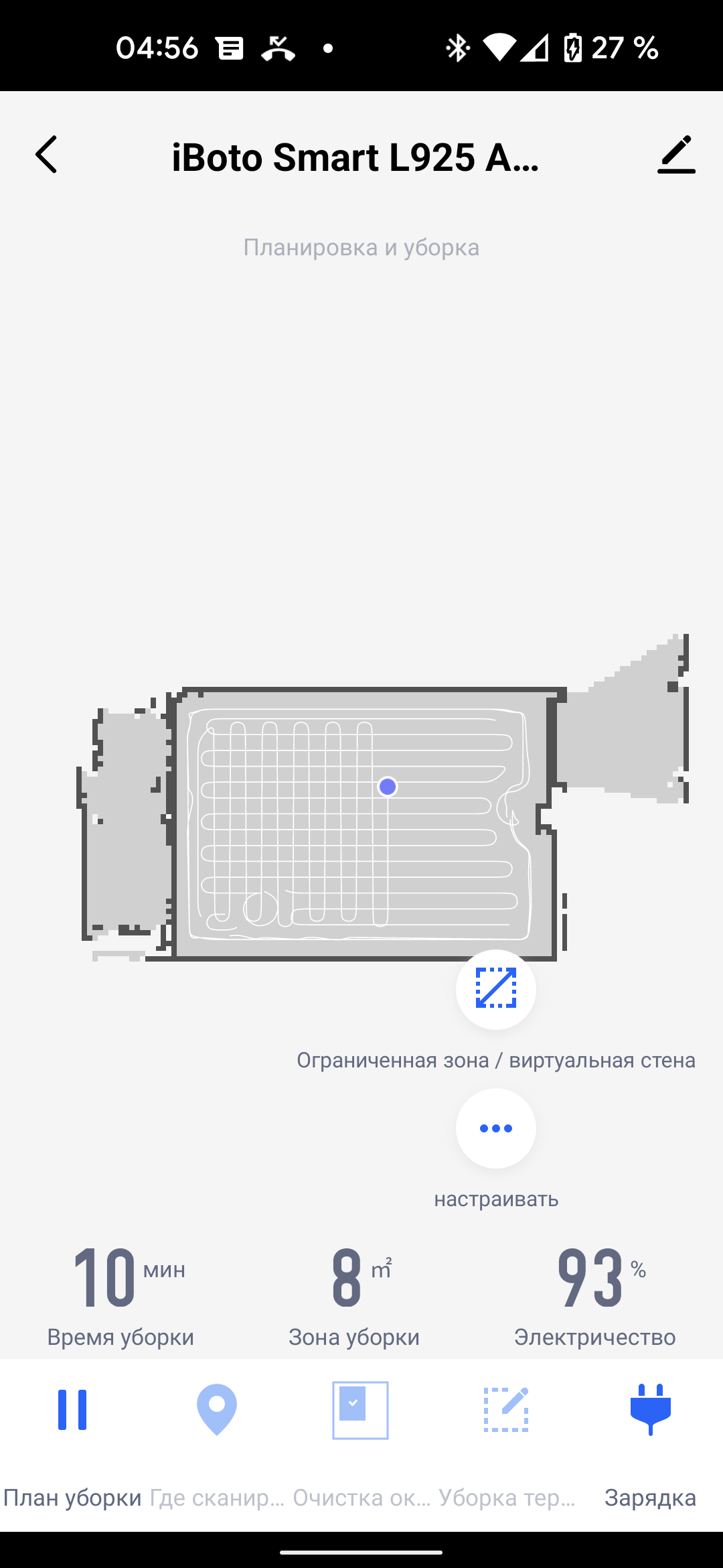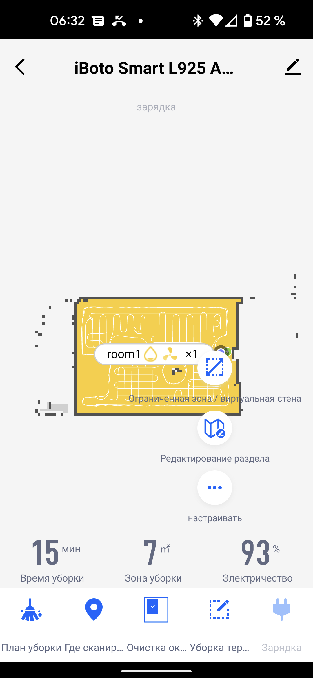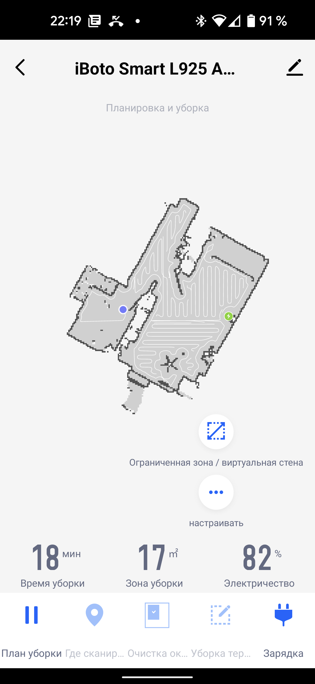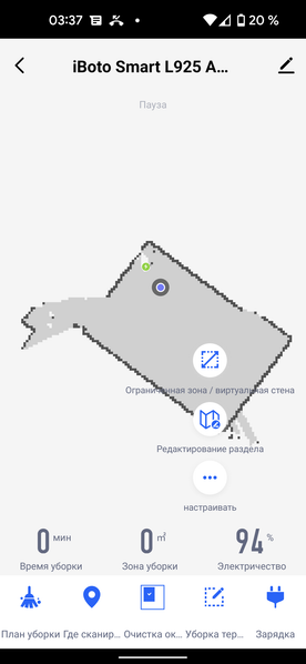 На главном экране приложения можно видеть карту помещения (как она выглядит с точки зрения робота), время текущей уборки, площадь, которую обошел прибор, и оставшийся процент заряда аккумулятора.