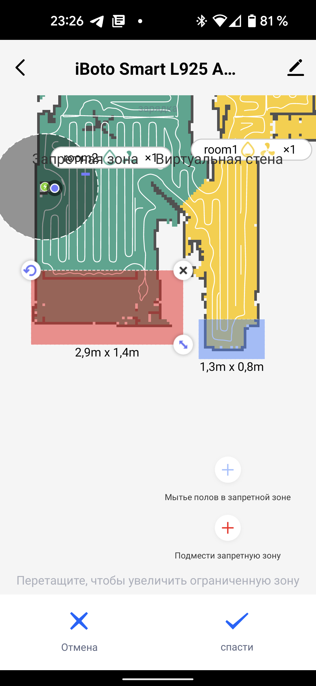 С помощью инструмента «запретная зона» на карте выделяются места, которые робот не должен посещать роботом. Это могут быть сложные для преодоления участки под мебелью, область с проложенными по полу проводами или зоны, где могут оказаться предметы, затрудняющие уборку (к примеру, миски домашних животных).