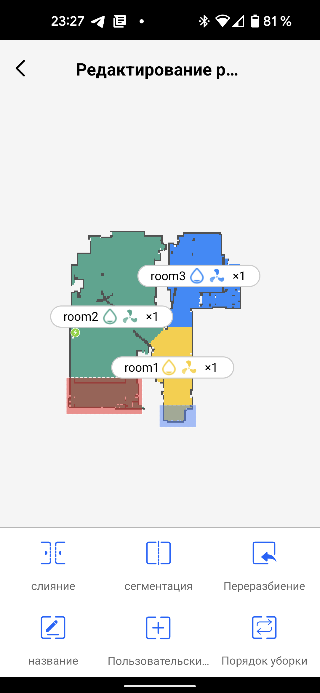 Тем временем карта помещения, которую построил прибор, поворачивается в более логичное положение и разбивается на зоны. Если автоматическое разделение квартиры на комнаты оказалось неудачным, пользователь может указать правильные границы. Здесь же можно дать комнатам свои названия и указать очередность следующих уборок.