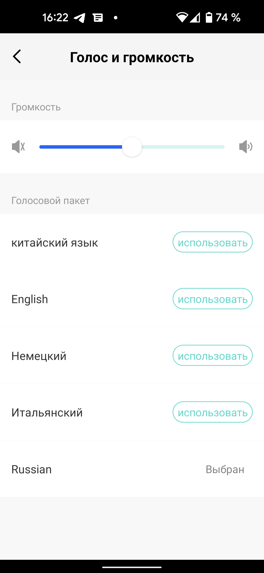 Пункт «Голос и громкость» позволяет выбрать нужный голосовой пакет (доступны китайский, английский, немецкий, итальянский и русский языки), а также управлять уровнем звука сообщений.