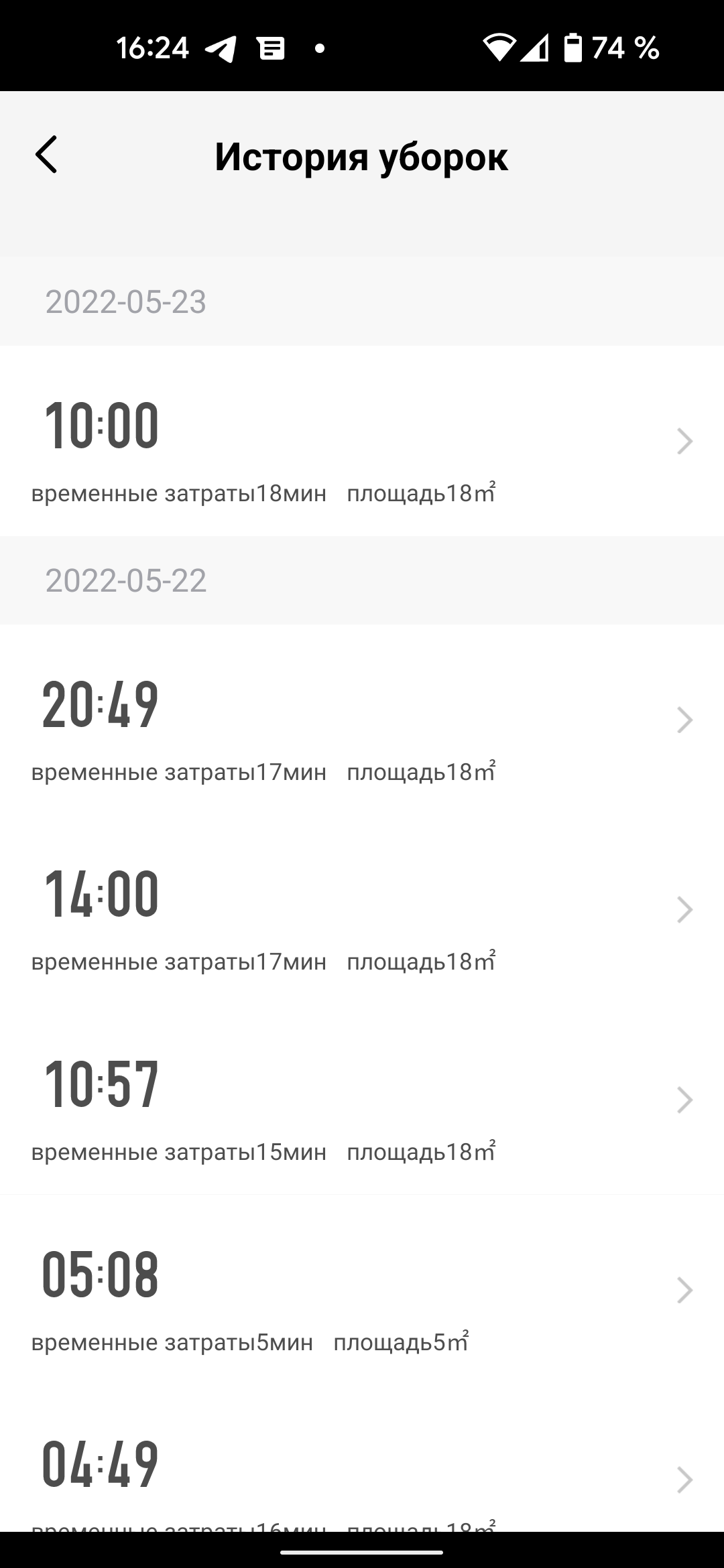 В разделе «История уборок» пользователь может ознакомиться с историей выполнения работ (доступна информация о маршруте, пройденном расстоянии и затратах времени). А вот обнулить эту информацию здесь нельзя.