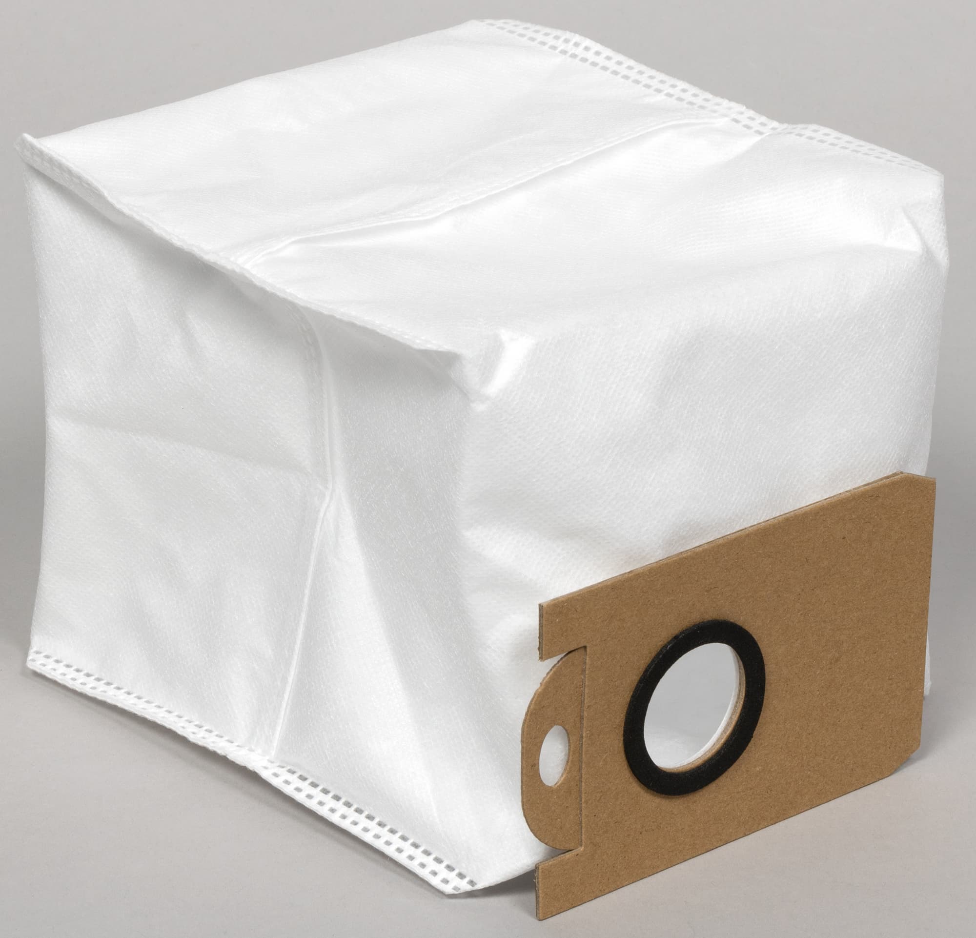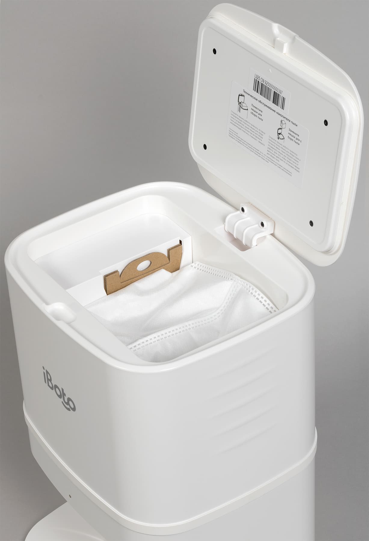 Высасываемые из робота отходы поступают в основной контейнер, где попадают в тканевый мешок, закрепленный в емкости с помощью картонной рамки.