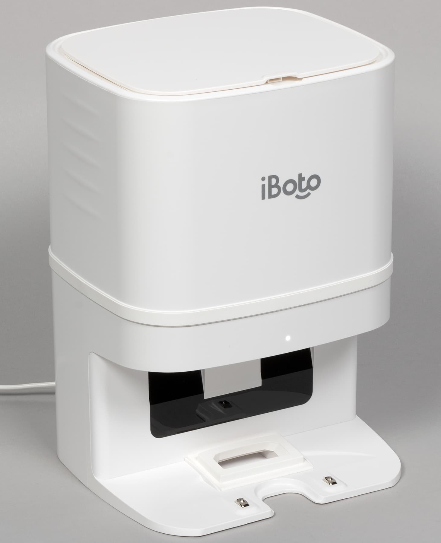 База с контейнером для мусора представляет собой внушительный параллелепипед, в нижней части которого есть ниша: там робот вытряхивает мусор и заряжается.